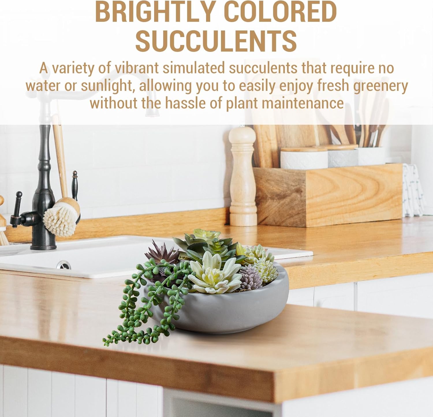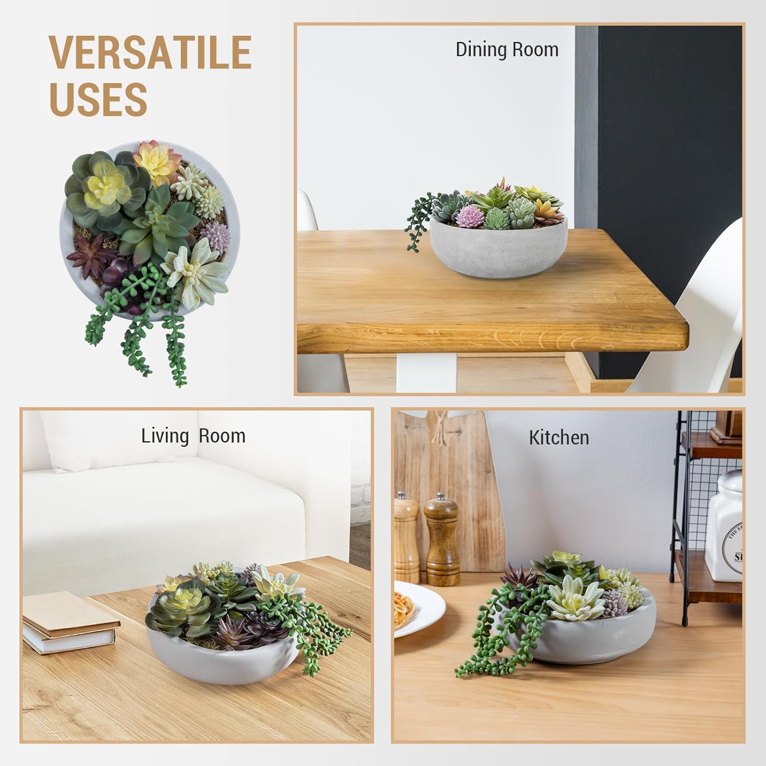 MyGift 8 Inch Round Modern Artificial Succulent Arrangement Potted in Gray Concrete Plant Bowl, Assorted Faux Mini Succulents in a Decorative Planter Pot