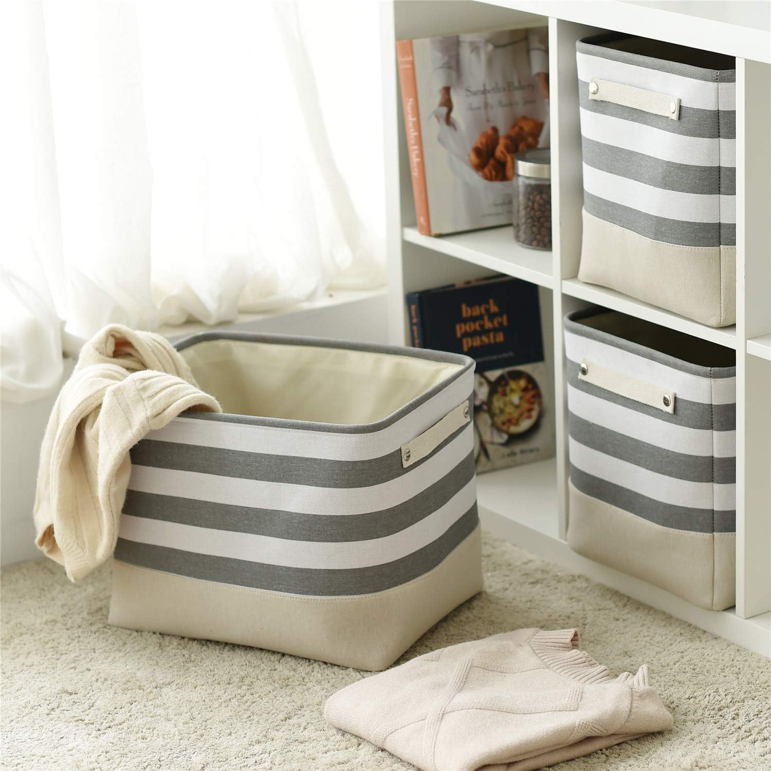- ARTISTIC: TheWarmHome Fabric Bins had great storage capacity and stylish. Minimalist design and neutral color exterior fabric can be integrated into any home decorations and styles. White cotton rope handles on the sides add a nature touch. The storage basket is like an art, not only provide a solution to many storage needs make home keep clean and tidy, doubles as a charming decoration. TheWarmHome, WARM YOUR HOME