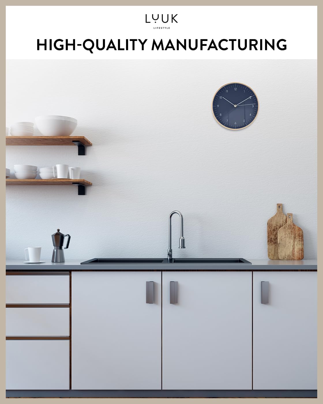 LUUK LIFESTYLE Modern Quartz Wall Clock with Silent Movement, Scandinavian Design, Kitchen and Living Room Clock, Gift idea, Trendy Home Decor, 10 inch, in Dark Blue and Gold