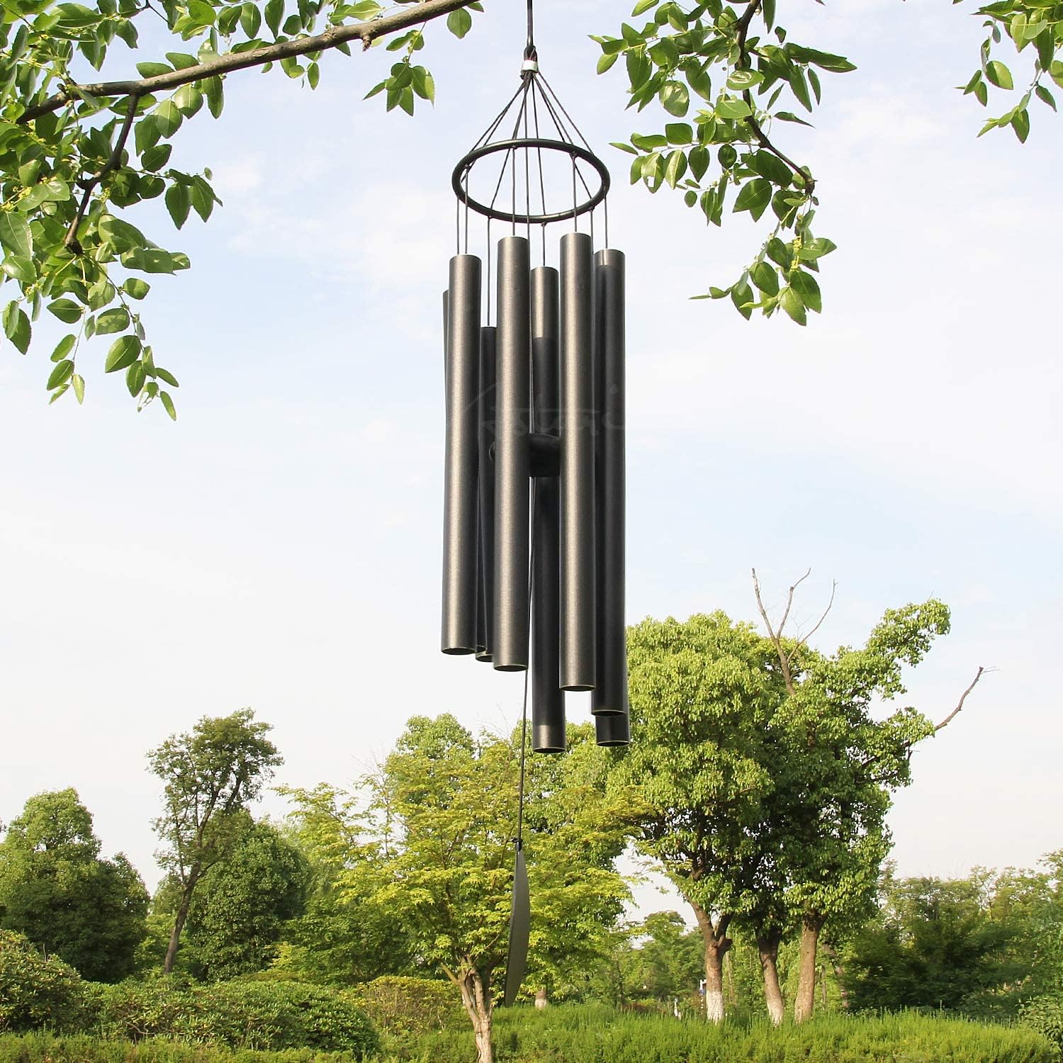 - Large wind chimes outdoor 38 inches: The overall length of the chime is 38 inches with a hook and well packaged. 8 recycled-aluminum tubes with anodized black finish. The wind chime is covered with waterproof coating for longer use in harsh environments. Each chime has a special remembrance sail at the bottom which catches the wind for the chime.