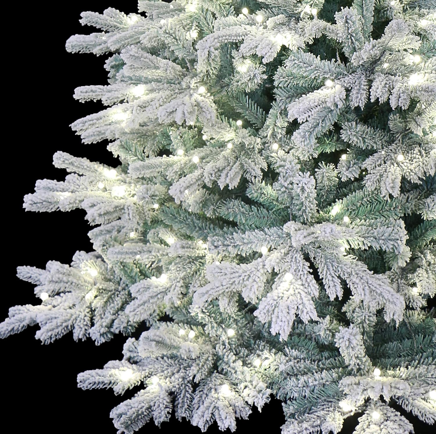 - Eco-friendly Material, Mix of Icy green PE tips towards outside for realism and classic PVC underneath for the fullness. Flocked with nontoxic artificial snow, creating a wonderful snowy Christmas spirit.
