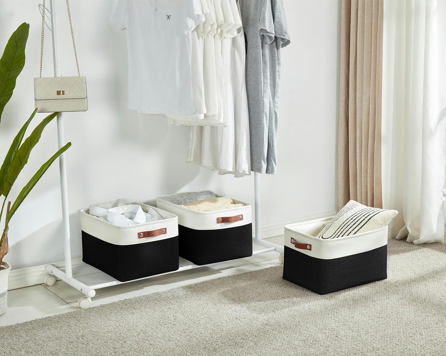 - Sturdy Construction: DECOMOMO closet storage bins are reinforced with upper metal frame and 2.5mm MDF fiberboard bottom to keep the baskets upright. Comes with dual faux leather handles with the weight bearing capacity of 25 lbs.