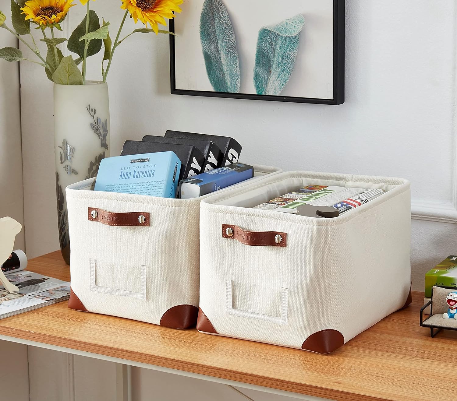 - Label & Organize: This basket features a label holder to help you find items without pulling out the bins each time. The luxurious canvas exterior fabric, faux leather handles and corner feet are designed for a modern and elegant feel.