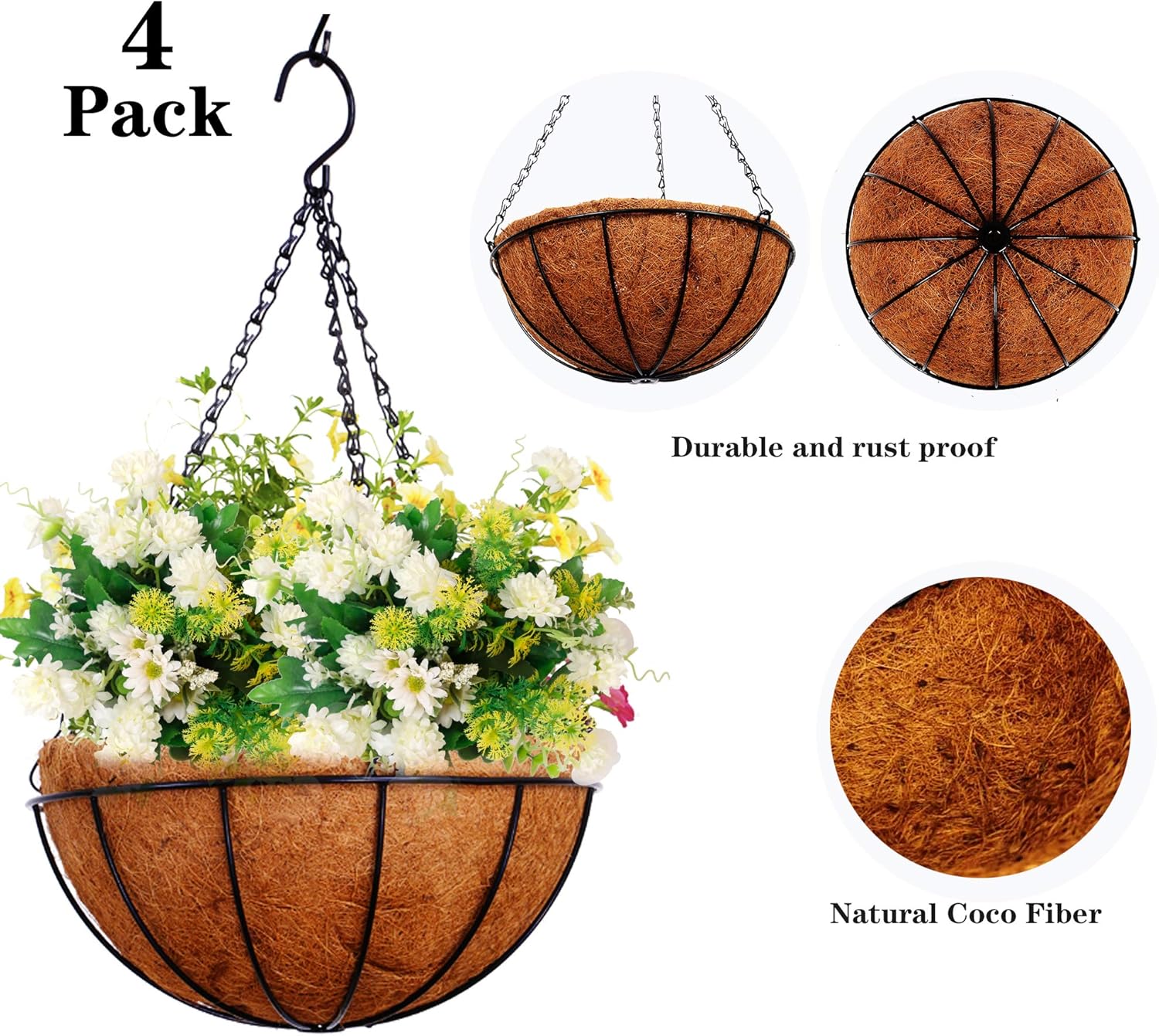 Hanging Planters Basket Outdoor Indoor(14 inch 4 Pack)-Coconut Coir Hanging Baskets for Plants Outdoor,Metal Wire Baskets with Coco Liner Window Box Planters, hanging Flower Pots For Railings…