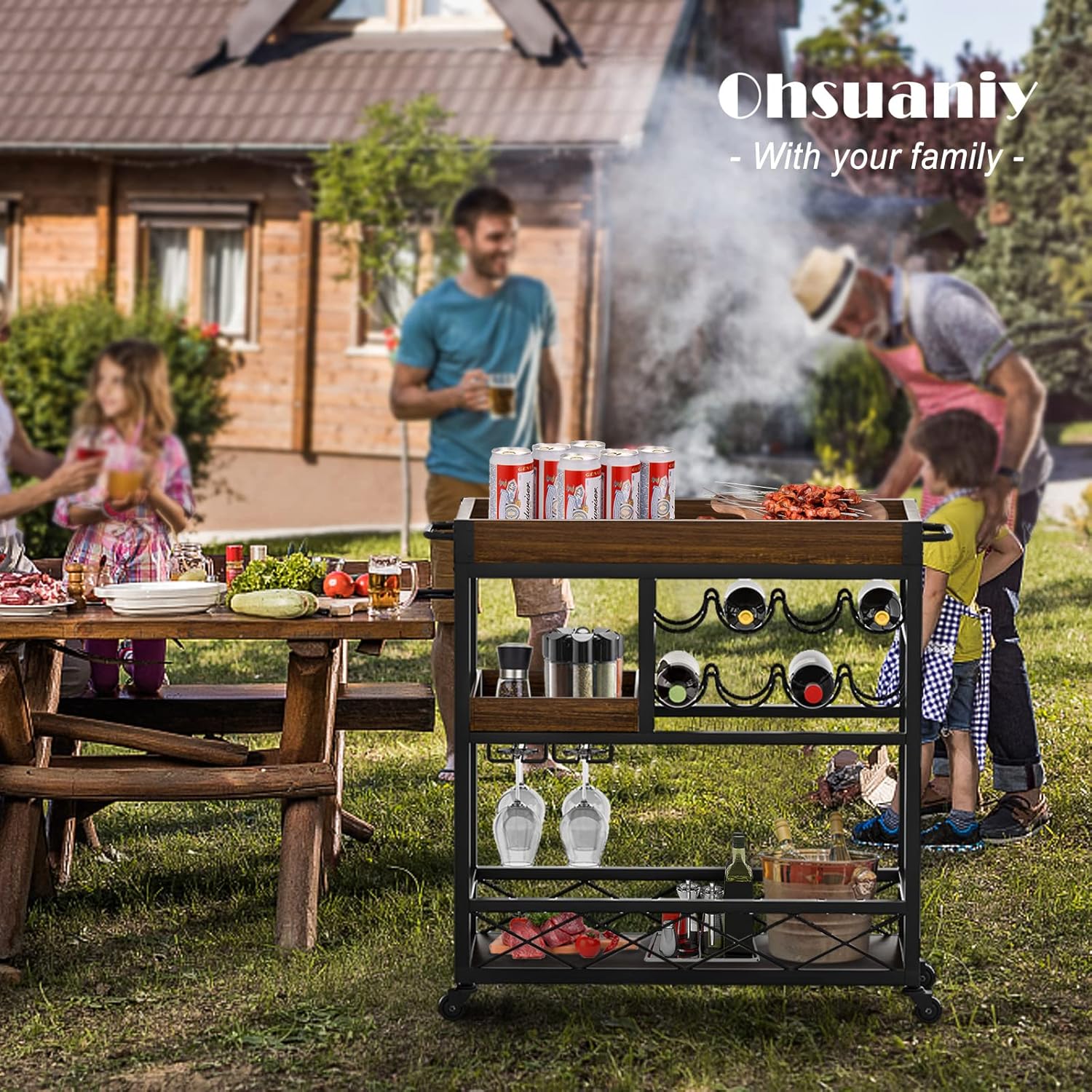 Bar Cart Industrial Kitchen Serving Carts for Home 3 Tier Storage Trolley with Wine Rack Glasses Holder Two Portable Trays Universal Casters with Brakes Rustic Rolling Cart Alcoholic Beverage