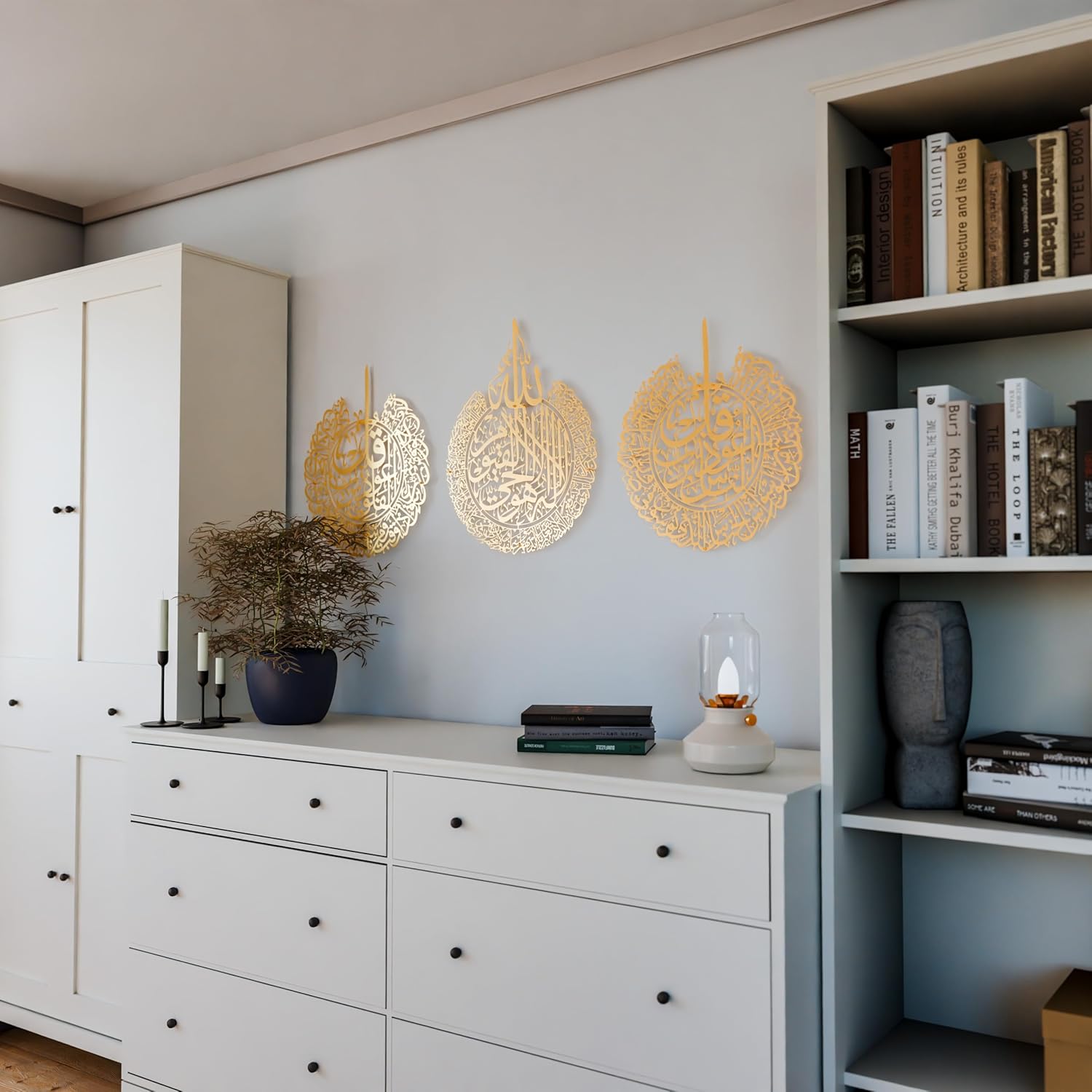 iwa concept Ayatul Kursi, Surah Al Falaq and Surah An Nas Islamic Metal Wall Art, Quran Verse Arabic Calligraphy Decor, Islamic Decorative Gift for Muslims during Ramadan (Matte Gold, Large)