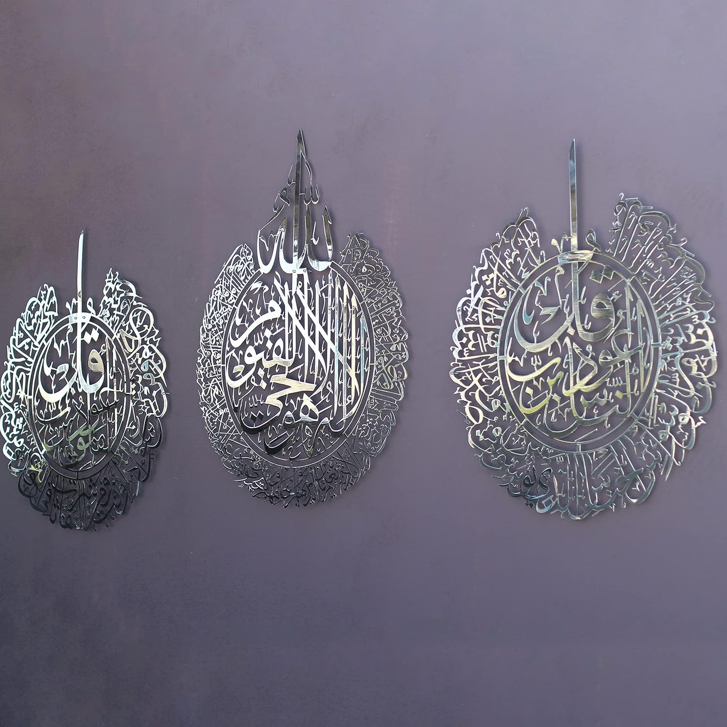 IWA CONCEPT Metal Set of Ayatul Kursi, Surah Al Falaq and Surah An Nas | Islamic Ramadan Wall Decorations | Modern Muslim Housewarming Gift | Arabic Calligraphy | Quran Wall Art | (Shiny Silver,