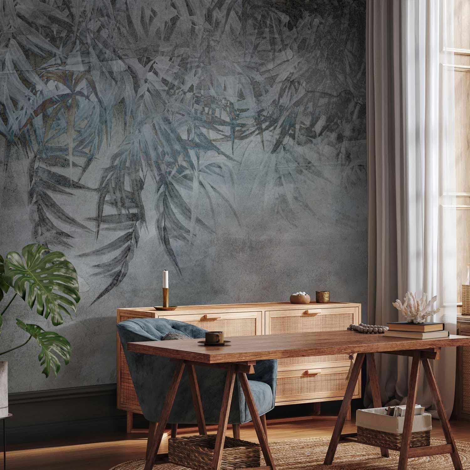 artgeist Wall Mural Leaves 116x83 in - XXL Peel and Stick Self-Adhesive Wallpaper Removable Large Sticker Foil Wall Decor Print Picture Image Design Palm Leaves Concrete Nature Grey b-C-10103-a-a