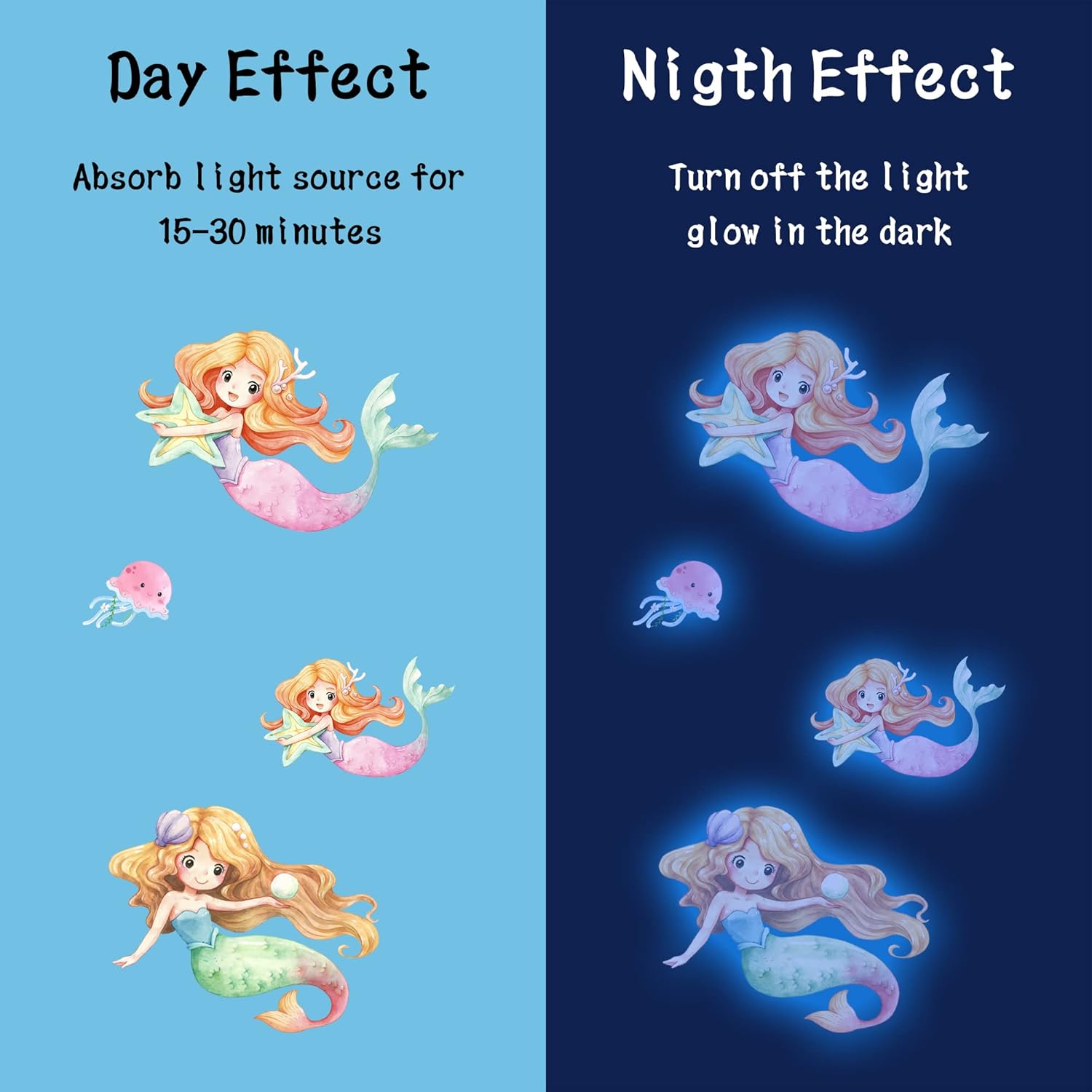 • 【Glow Bright and Long Time】- Our mermaid decals need to absorb light before they emit light. First you need to put them under sunlight,room light or flashlight for 15 to 30 minutes , then turn off the light, the sticker will emit a soft blue light without glare.Note:Please ensure the light shines unobstructed onto the decals.