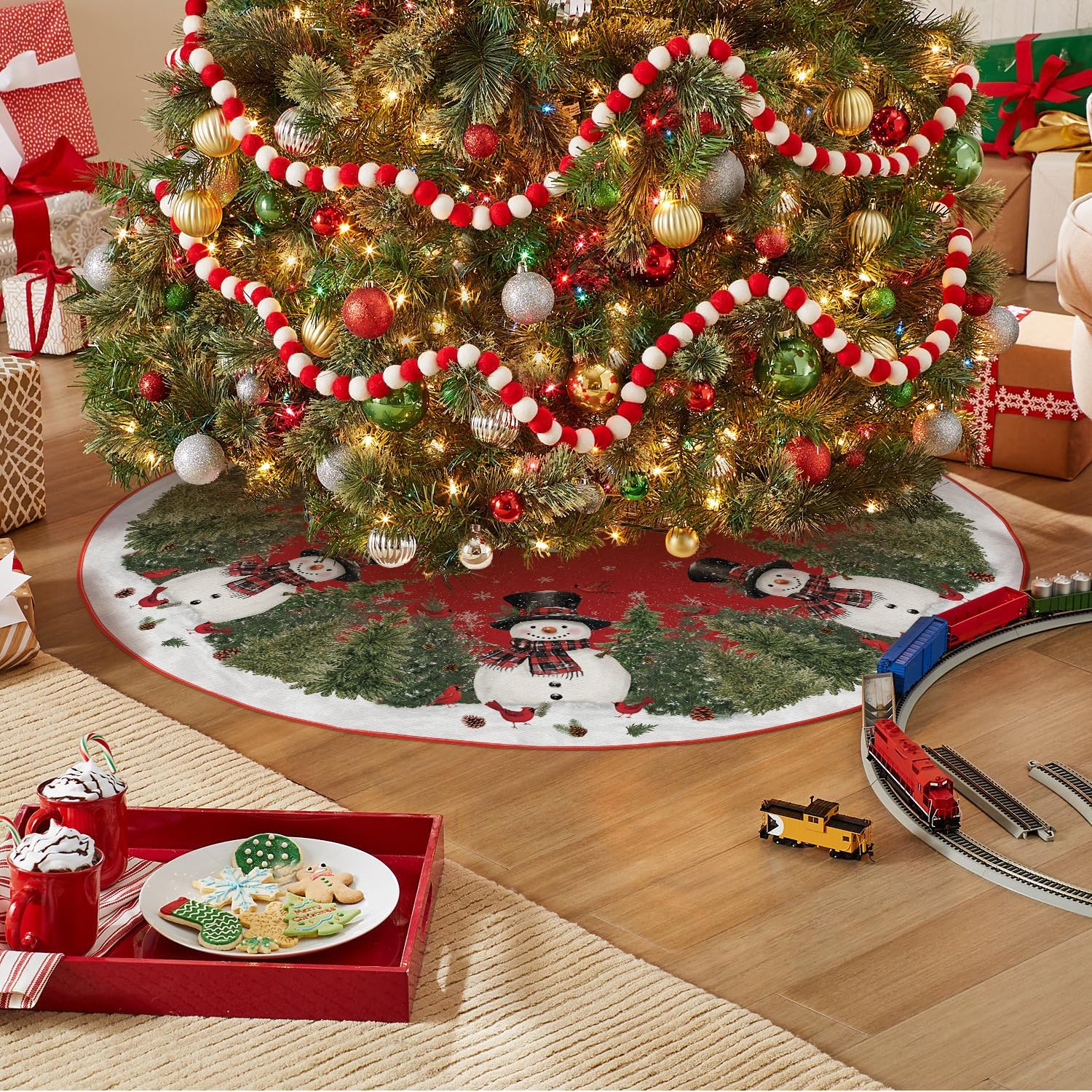AVOIN colorlife Cardinals Cedar Snowman with Scarf Christmas Tree Skirt, Xmas Winter Holiday Party Tree Mat Indoor Outdoor Decoration 36 Inch