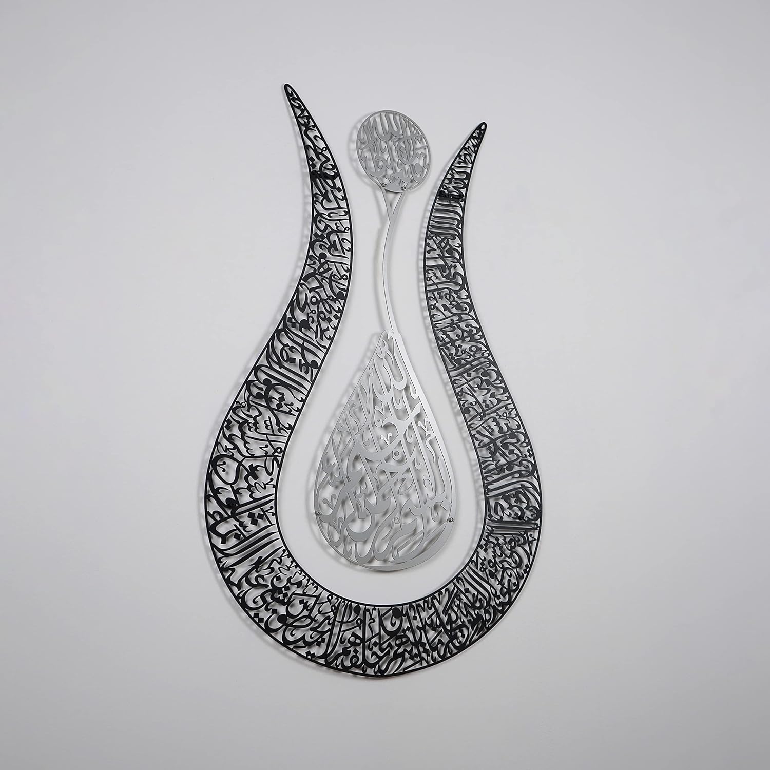Ayatul Kursi Tulip Shaped Metal Islamic Wall Art, Throne Verse Arabic Calligraphy Decor, Quran Decor Gift for Muslims at Ramadan and Hajj (67 x 43 cm | 26.8 x 17.2 inches, In Silver | Out Black)