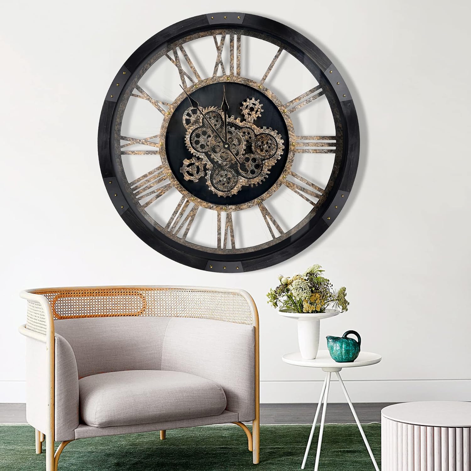 DORBOKER 36" Extra Large Wall Clock with Moving Gears, Oversized Giant Industrial Steampunk Rustic Clocks for Wall Decor Living Room Home Office, Solid Wood Vintage Black and Bronze Gears