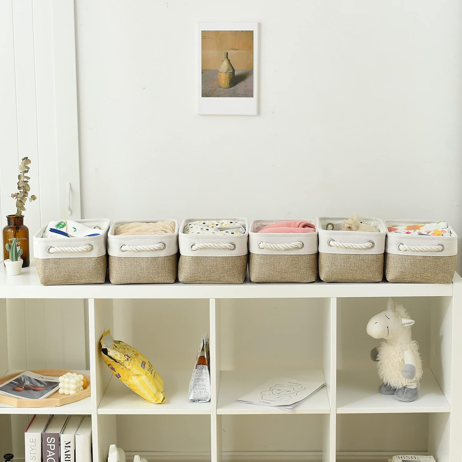 TcaFmac Storage Bins for Shelves - Small 6 Pack Collapsible Storage Basket for Organizing, Fabric Storage Cubes with Handle for Closet Cloth Toy Gift Kids (White & Khaki 11.8x7.8x5.2 inch)