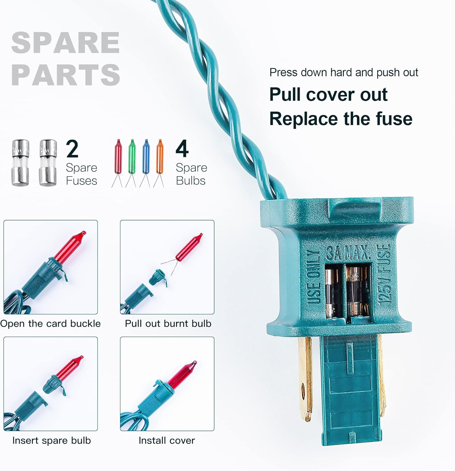 - 🎄Unique Design Christmas Lights: The bulb has a snap-on design and is very easy to replace. When one of our bulbs breaks, it doesn't affect the other bulbs. This is a very special design. You can replace damaged bulbs individually with the spare bulb or fuse provided by us.