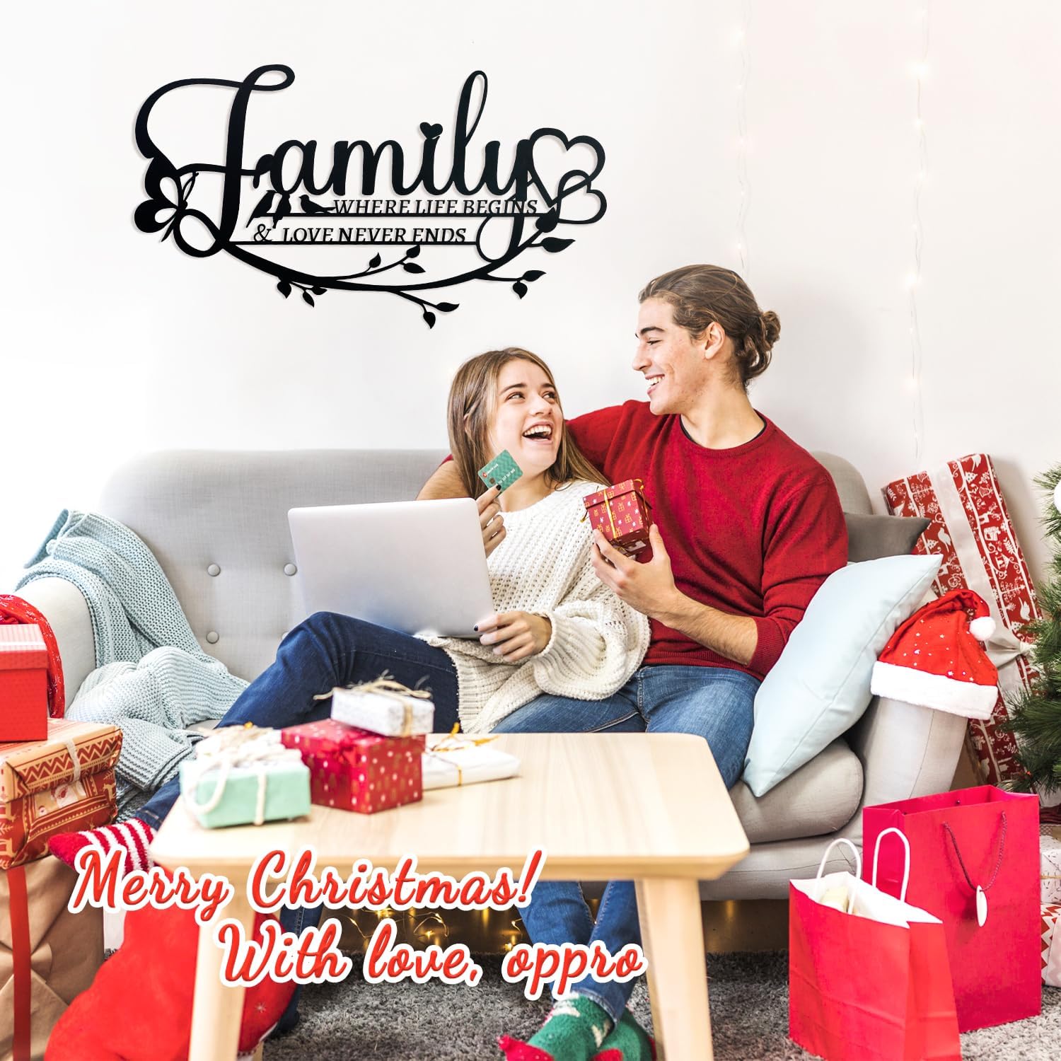 Family Sign Black Metal Wall Art Decor, Oppro Family Where Life Begins Love Never Ends Wrought Iron Wall Decorations, Hanging Plaque Letters Signs Home Decor for Living Room Bedroom Dining Room Kitchen Mother's Day Father's Day