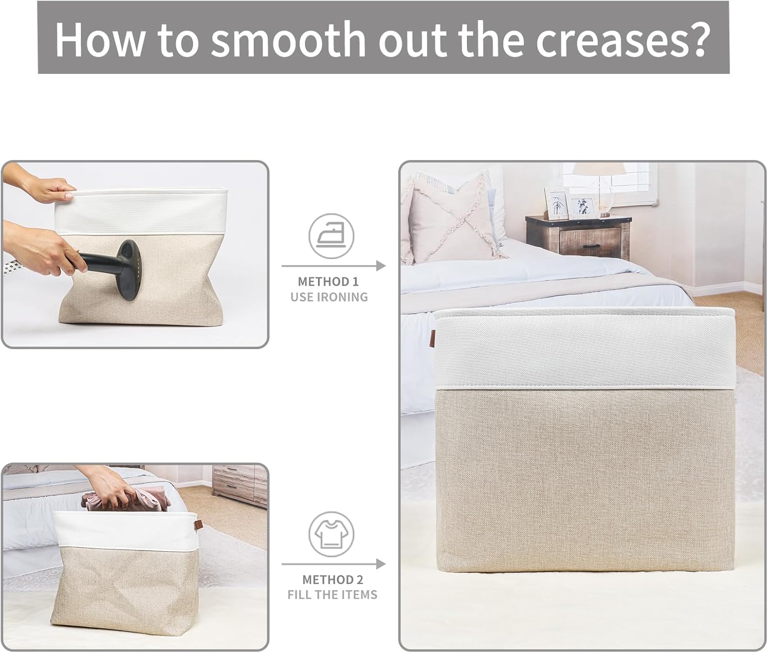 • 【Maintenance & Care Tip】 - Collapsible design for space saving. Our foldable baskets comes in a compression packing which may result in wrinkled storage bin during the long transit. Get rid of the wrinkles by either stuffing the fabric storage bins with blankets and pillows for a few days or steam iron them at low-heat setting. The organization baskets are easy to clean, you can dust the basket with a soft cloth with light soapy water when needed.