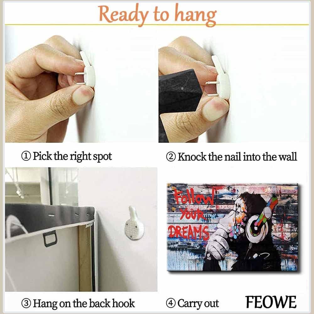 Framed Banksy Graffiti Canvas Wall Art Follow Your Dreams Monkey Poster With Headphones Prints Street Painting Picture Man Cave Wall Decor Pop Art for Living Room Ready To Hang 12"Wx16"H (30x40cm))