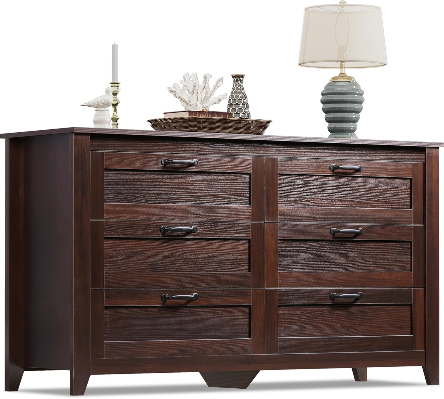 WLIVE Wood Dresser for Bedroom, Double 6 Drawer Dresser with Metal Handle, Large Wooden Chest of Drawers for Living Room, Hallway, Closet, Rustic Brown