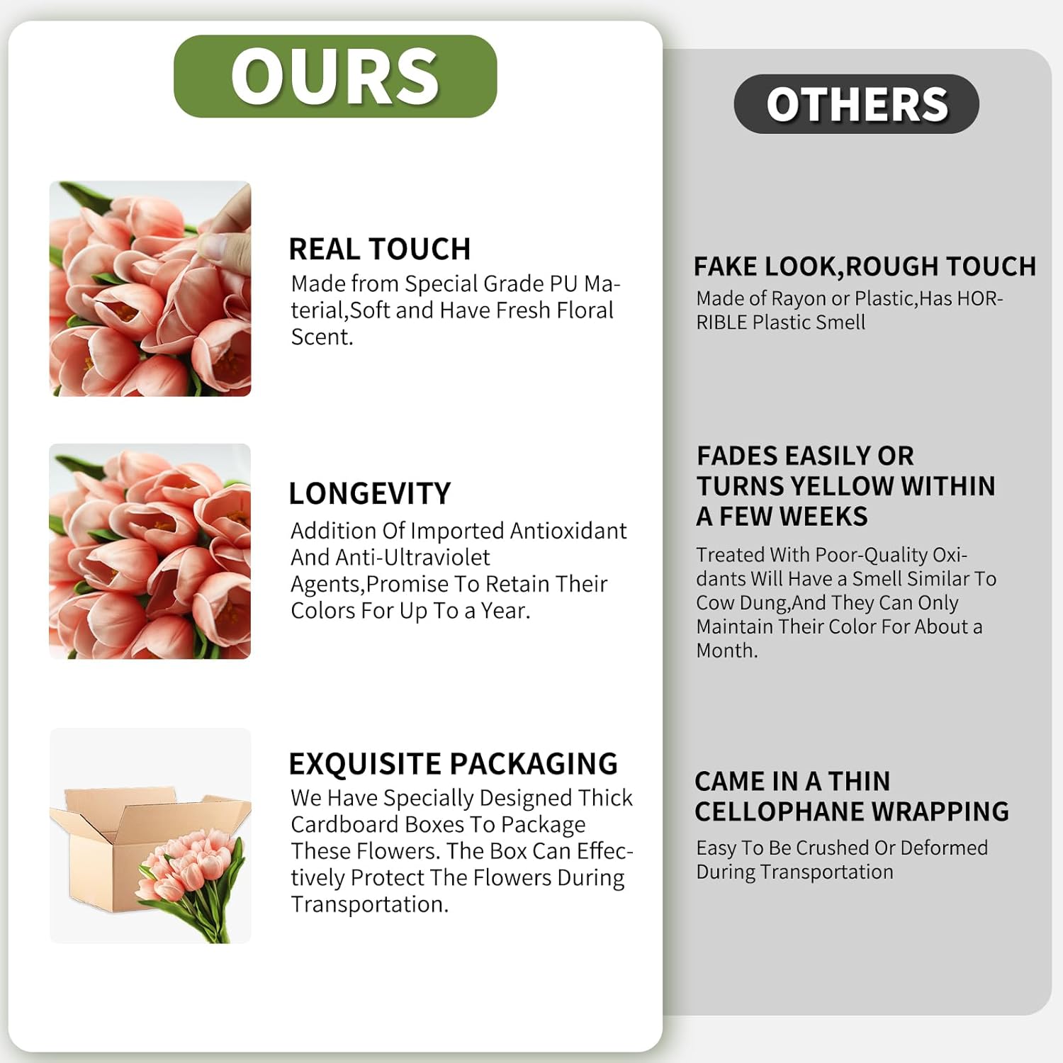 - High-Quality PU Material:Our artificial tulips are made of high-quality PU material,providing a soft touch just like real flowers,the realism is impressive. Completely eliminating the issue of plastic or chemical smells,making the flowers more environmentally friendly and harmless to the human body.