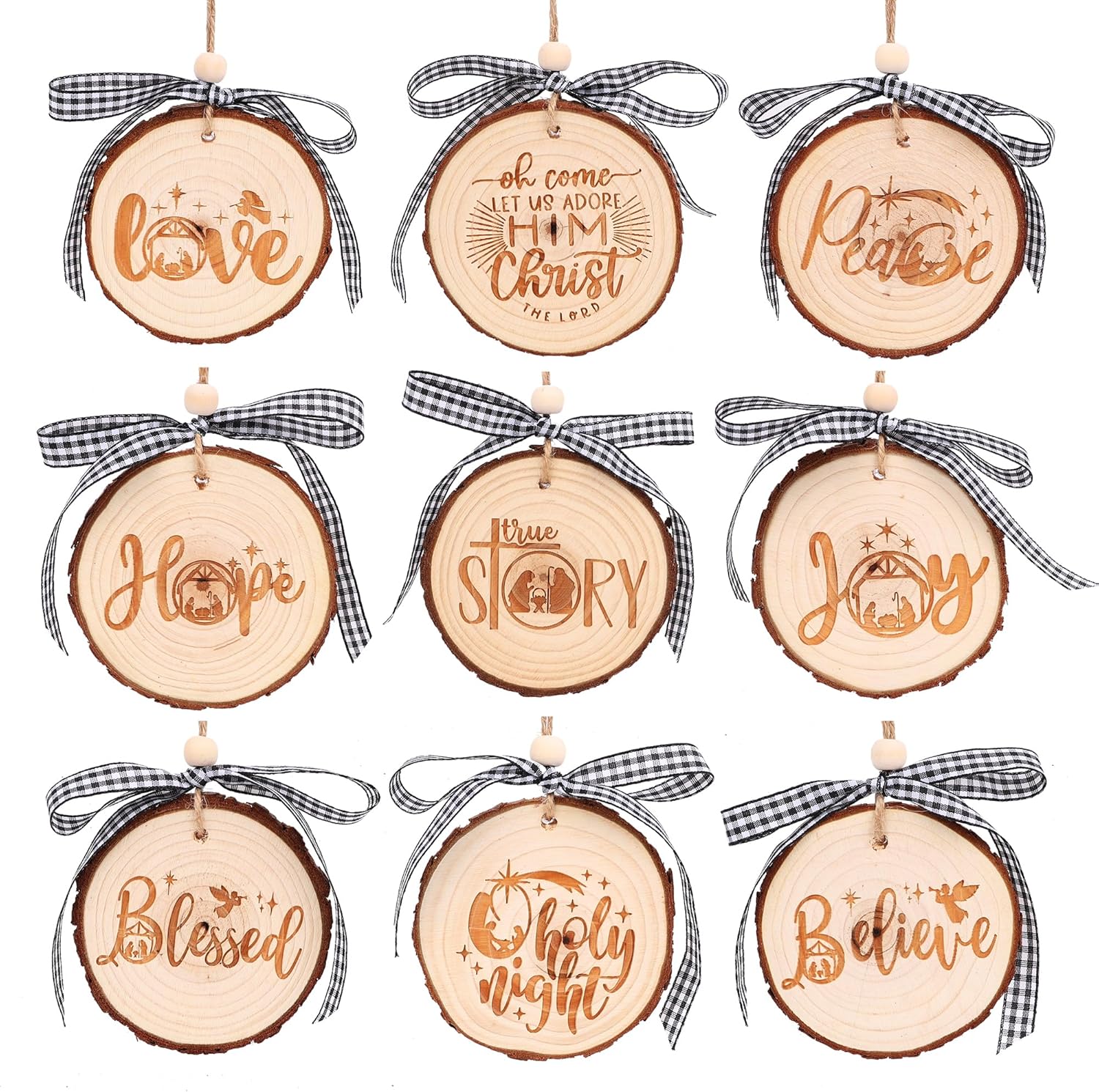 - Premium craftsmanship:Made from 9mm natural wood slices, the surface is smooth. Double-sided engraving. Comes with black and white buffalo plaid as well as red and black buffalo plaid ribbons. You can choose the ribbon color according to your Christmas decoration theme. Each ornament is already equipped with rope.