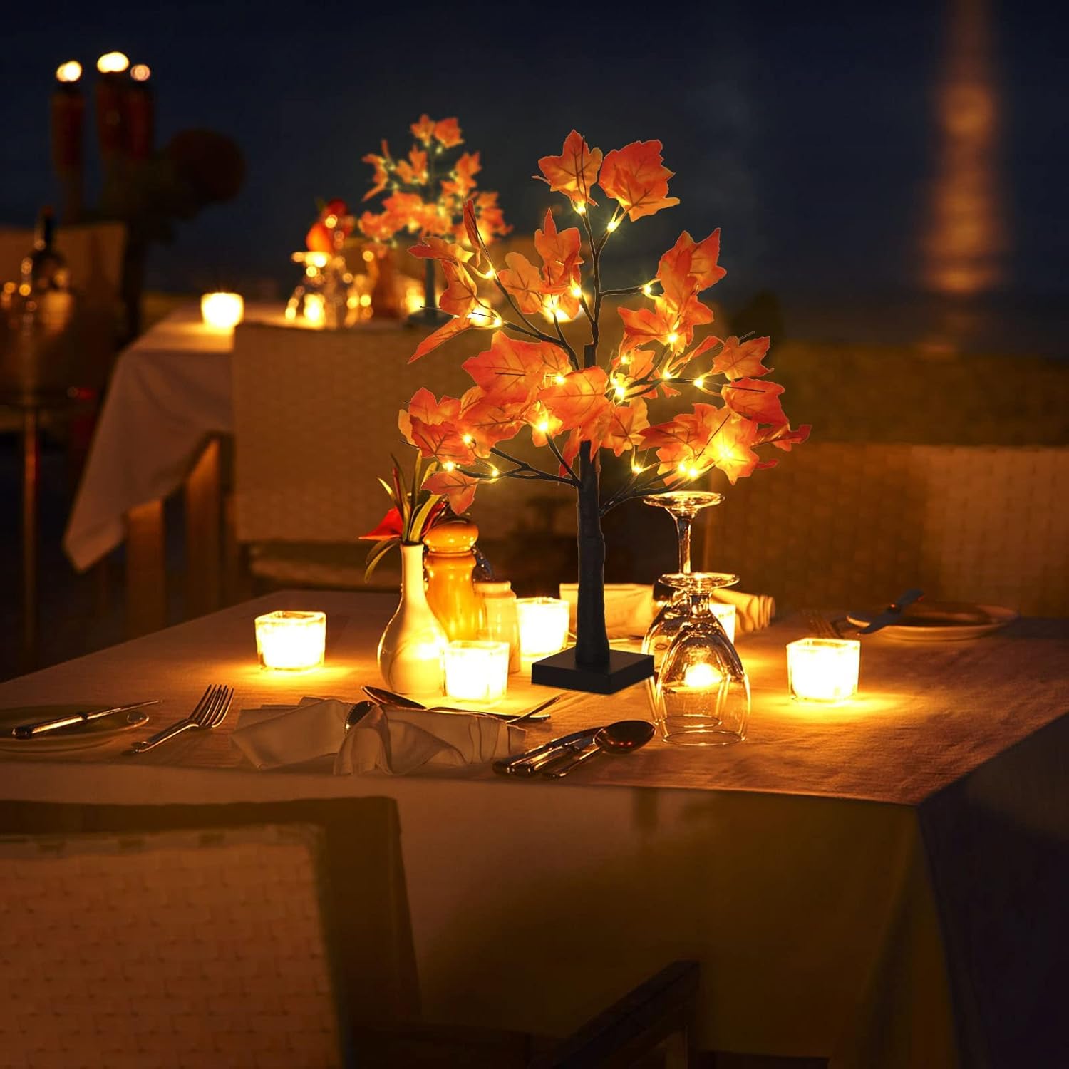 - đăLight Up Maple Tree Lightsă 4pack lighted fall decor tree ,Each maple leaf tree 24" overall height, 4" x 4" base, 24 warm white LED light up maple trees, powered by 3 AA batteries (not included) and USB power, perfect for desktop decorate.Fall Decorations for Home-This lighted fall tree is a wonderful and unique item that can brighten up any home.