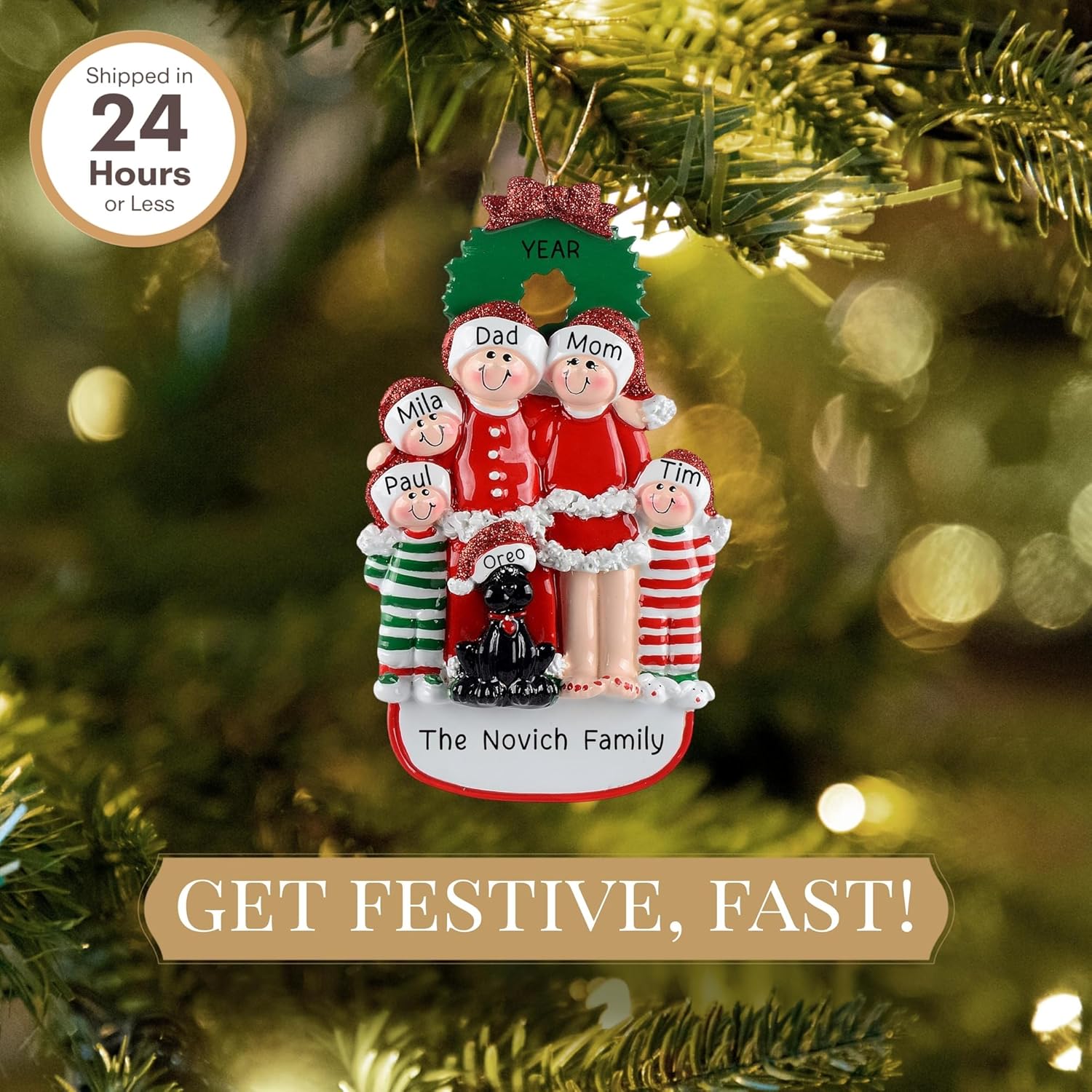 Personalized Family of 5 with Dog Ornament 2025 | Free 24h Customization | Christmas Ornaments for Tree | Custom Gift Wrapped Black Pet Keepsake for Dog-Lovers