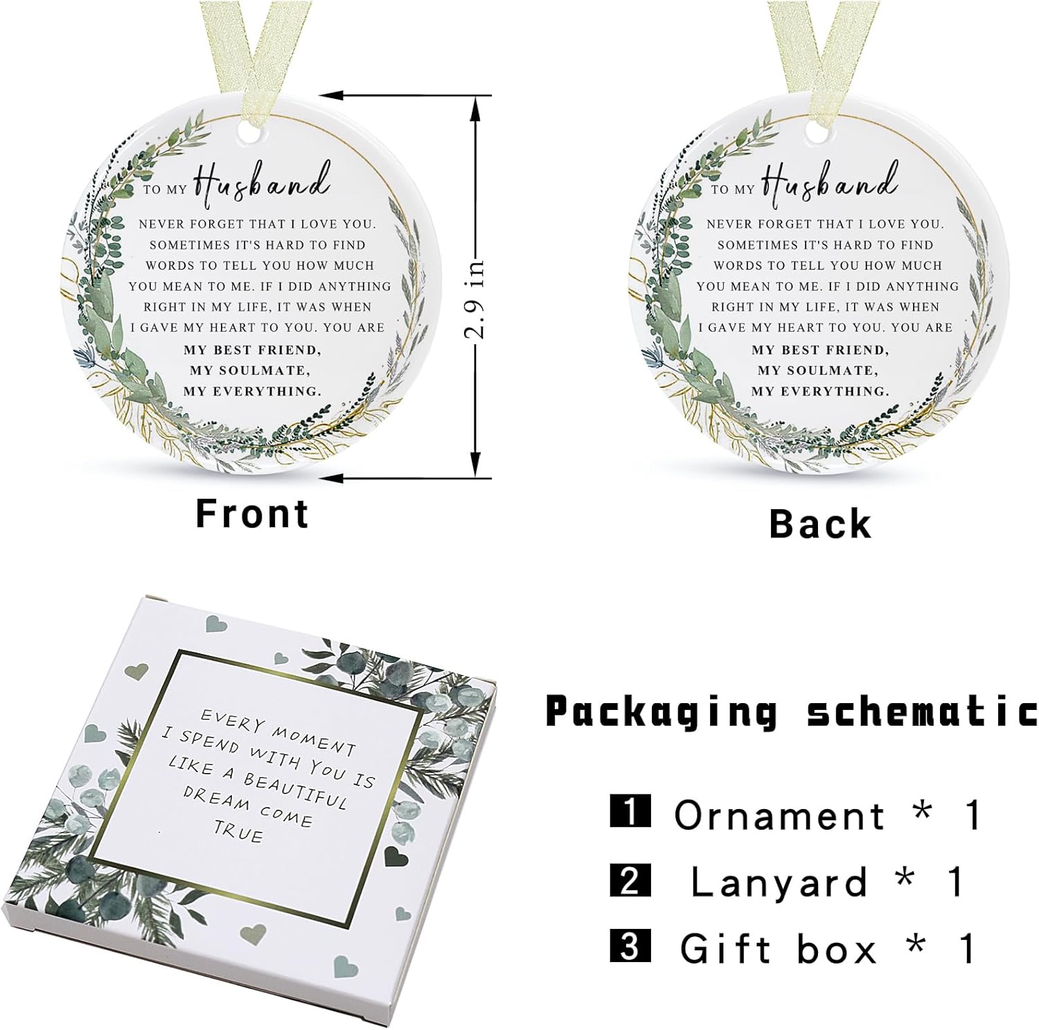 • 🌼【Perfect and delicate size】This is a husband memory ornament with a diameter of 2.9 inches and a thickness of only 0.18 inches. The product includes: a round husband ornamentt*1, a gift box*1 and a lanyard*1. The gift box comes with it makes it easy for you to give the best husband ever gifts directly to family and friends and other special people in your life, and the lanyard that comes with it helps to hang it easily on the Christmas tree or anywhere you want.