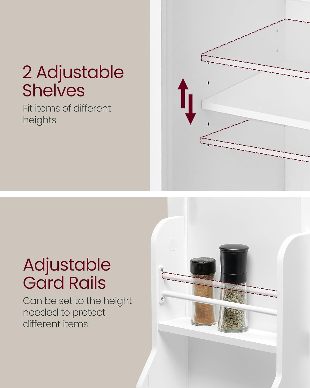- [Adjustable Shelves] This kitchen pantry cabinet comes with 2 adjustable shelves that can each be adjusted to 5 different heights and can hold up to 50 lb, allowing you to store items of varying heights