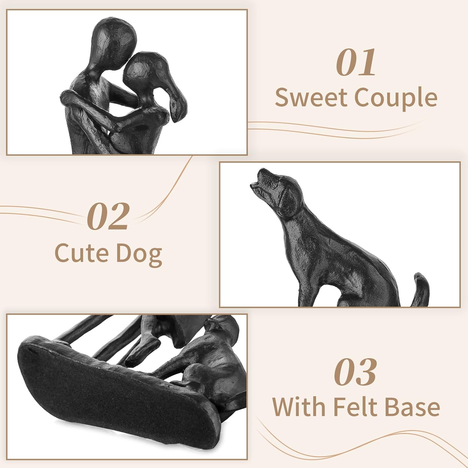 - LOVELY COUPLE AND DOG SCULPTURES - A joyful family of three. This exquisite iron couple statue captures a beautiful moment of love, with one couple sharing a heartfelt kiss, while their loyal dog sits beside them, witnessing the happy scene. It symbolizes a harmonious and joyful family of three, adding emotional depth to your decor.