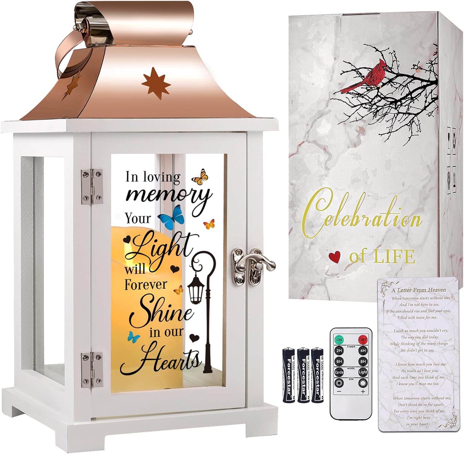 - Condolence Gifts&Premium Quality & Easy to Use: The saying on the lantern was very clear and easy to read, which won't fade or wear off easily. The memorial lantern has a sturdy base and a solid metal handle for hanging. The LED candle comes with a remote control with timer and usage directions. The batteries can be easily put or replaced by opening the bottom of the LED Candle.For your convenience and that of the recipient, the gift box is equipped with 3 AAA batteries, ready for use upon receipt.