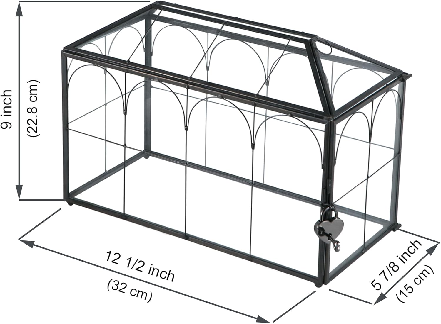 - Enhance your wedding reception with our exquisite wedding card box. Measuring 12.5 x 6 x 9 inches, it boasts a heart-shaped lock and 2 keys. This versatile box also serves as a charming flower girl basket, adding a decorative touch to your special day. Delight your guests with its elegant glass design, creating lasting memories for occasions like Valentine's Day, Christmas, Thanksgiving, and more.