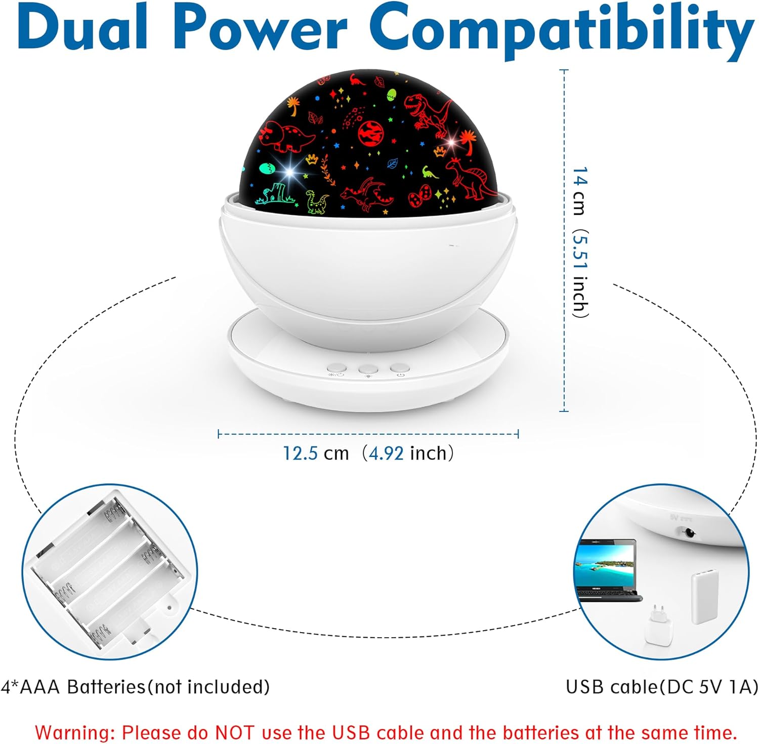 - Dual Power Options: Powered by a USB cable (compatible with computers and power banks) or 4 AAA batteries (not included). Do not use USB and batteries simultaneously. We recommend using USB power for safety, preventing kids from playing with batteries