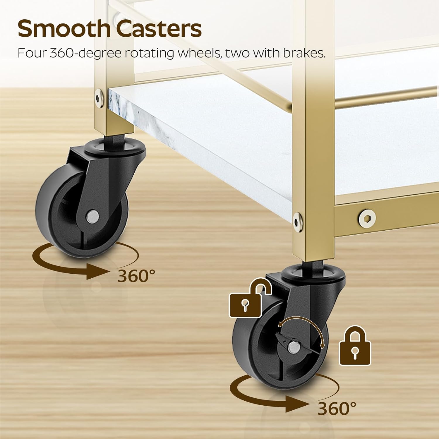- Thoughtful Design: Four swivel casters (2 with brakes) allow you to move the service cart anywhere or lock it in place. The fence design on each tier is practical and visually appealing, preventing items from falling during transportation