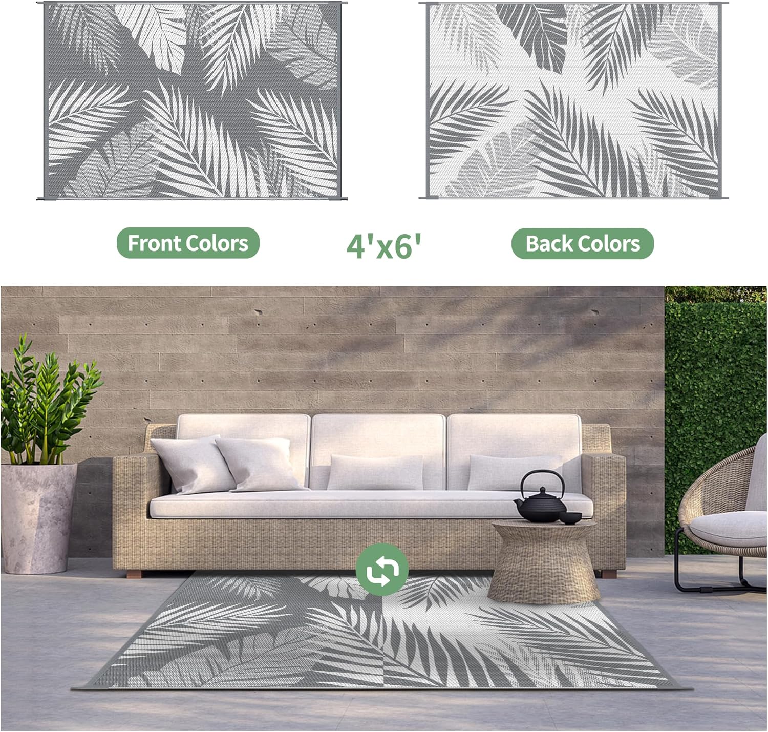 - Palm Leaf Design & Double-Sided Pattern: GENIMO reversible fall outdoor rug is designed with a double-sided pattern, completing the unique layout of multiple palm leaves. The 2 shades of grey and white achieve the ultimate fusion. Either side can blend perfectly with nature and look very full and comfortable, making it a versatile piece for fall decor
