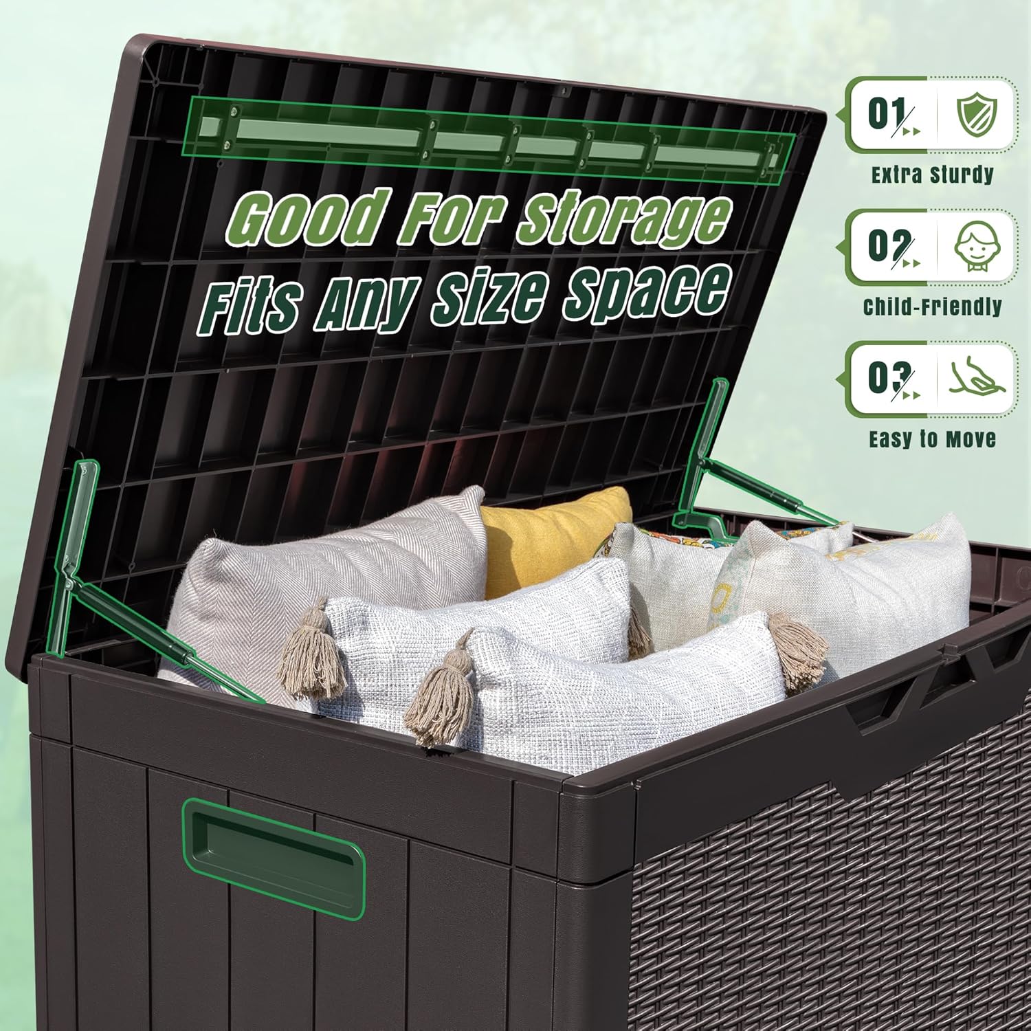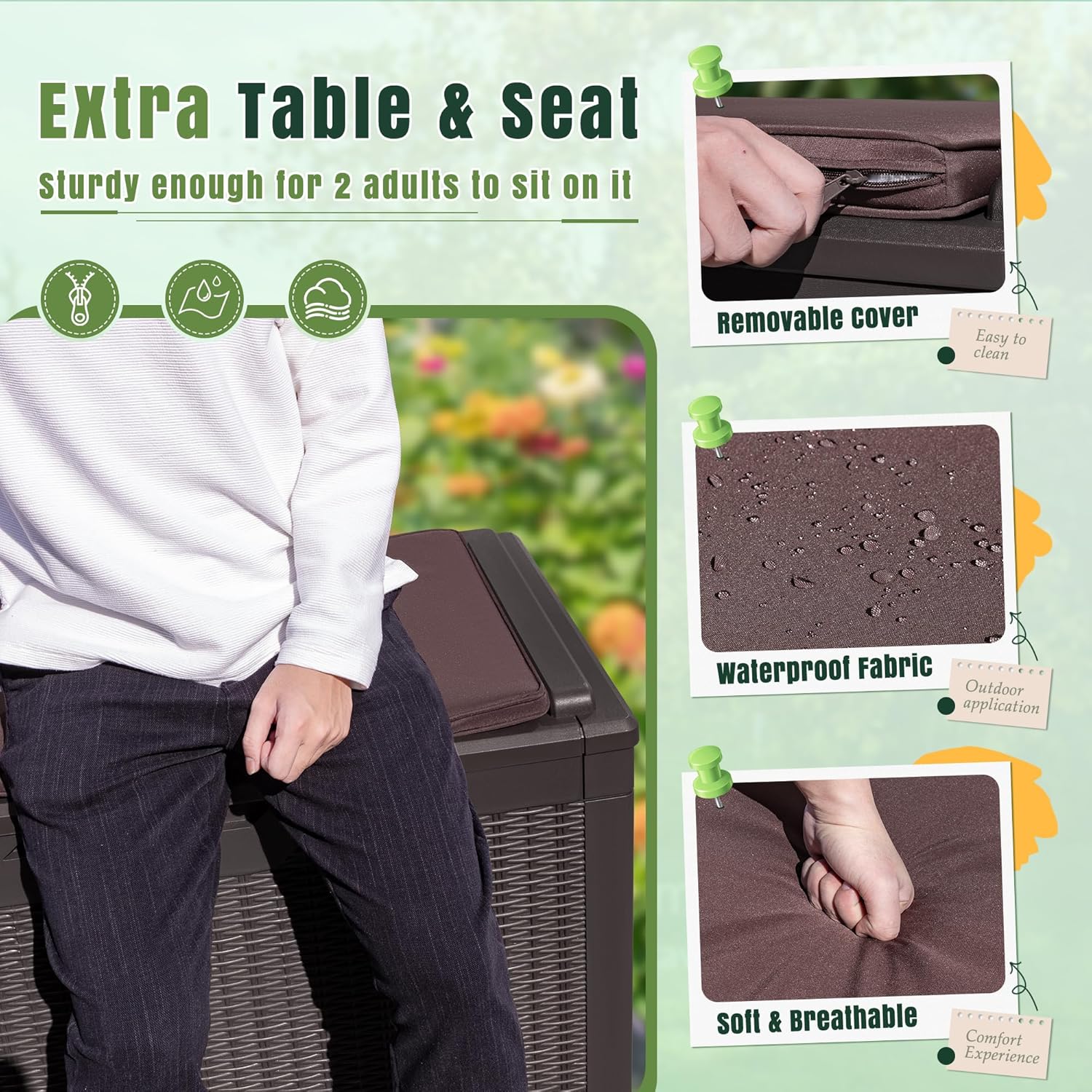• EXTRA CUSHION:Besides helping you to organize your space, the deck box is equipped with a removable thick cushion, you can also use it as a stool to ensure your safety when opening and closing the box.