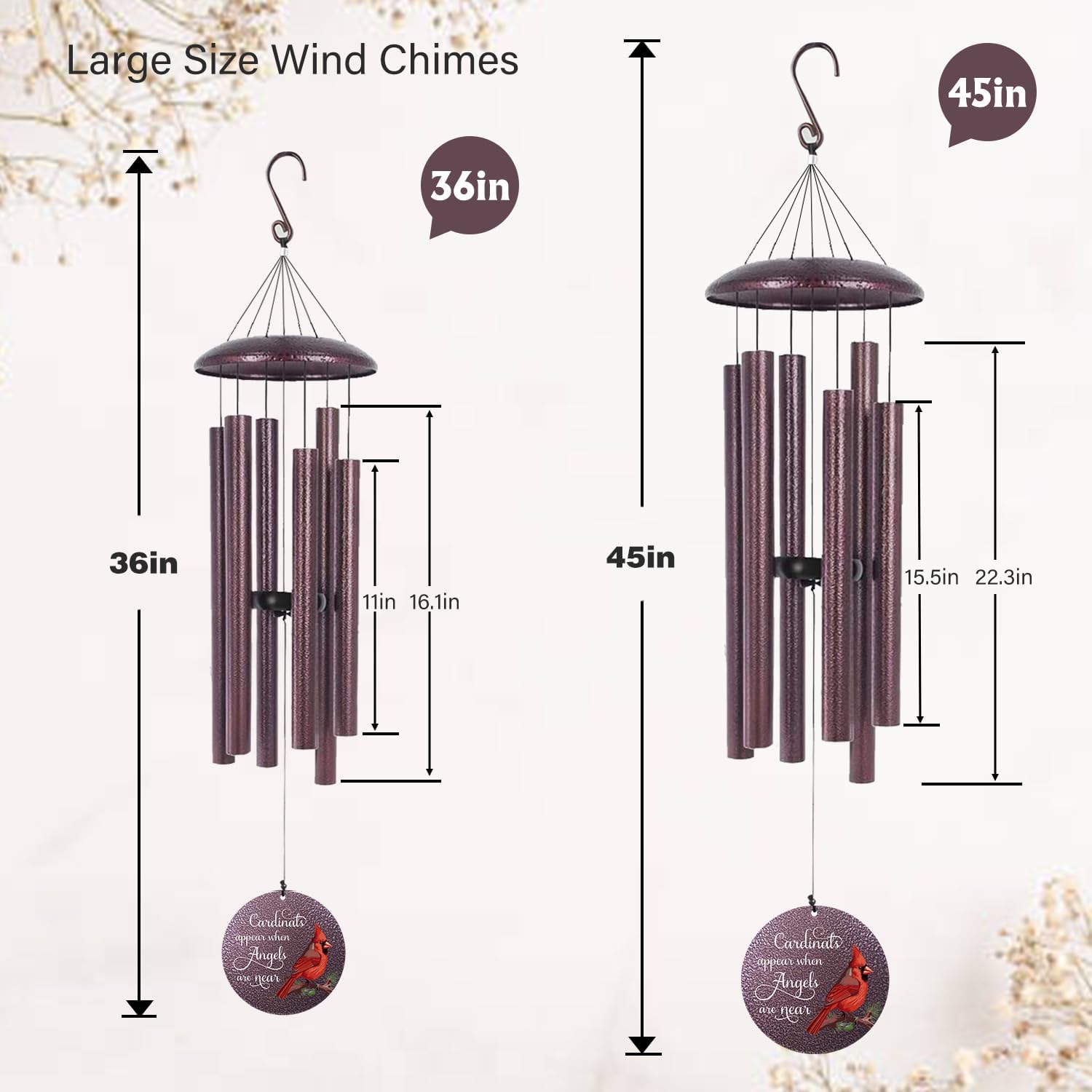 - LARGE OUTDOOR WIND CHIMES: Our large wind is available in 36" and 45" sizes. They are made of bronze metal with a waterproof and anti-corrosion coating and can be hung in the yard for a long time. They can easily decorate the backyard, garden, window, terrace, or living room.