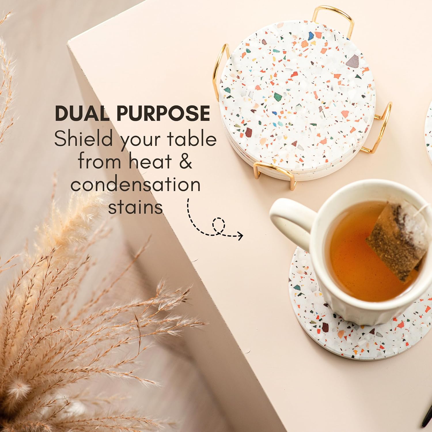 • Minimalism & Elegance: This coasters with holder comes with a gold metal holder for easy storage and 6 marble drink coaster to suit all centerpiece table decor. Our water absorbing coasters are available in green, black, navy blue, white coasters.