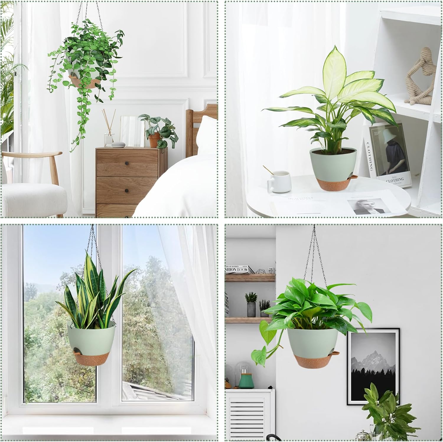 Hanging Planters for Indoor Outdoor Plants, 2 Pack Self Watering Hanging Pot with Drainage Holes & Removable Tray (Green, 6'')