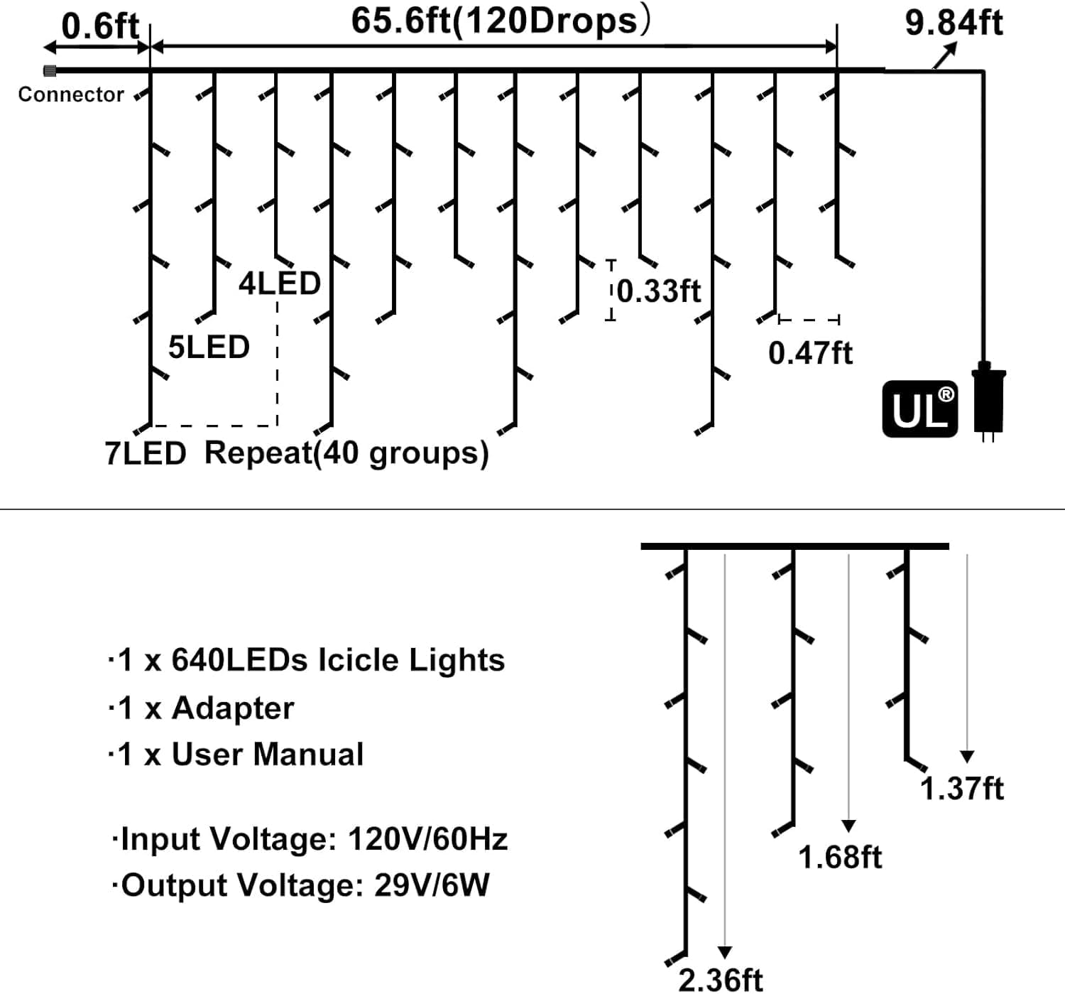• Upgraded 8 Modes Halloween Lights: The icicle Lights have 8 selections of light pattern: 1.Combination 2.In Waves 3.Sequential 4.Slo-Glo 5.Chasing/Flash 6.Slow Fade 7.Twinkle/Flash 8.Steady On. Different lighting effects are controlled by the button on the plug. These beautiful and vibrant outdoor lights will bring you a lot of festive atmosphere.