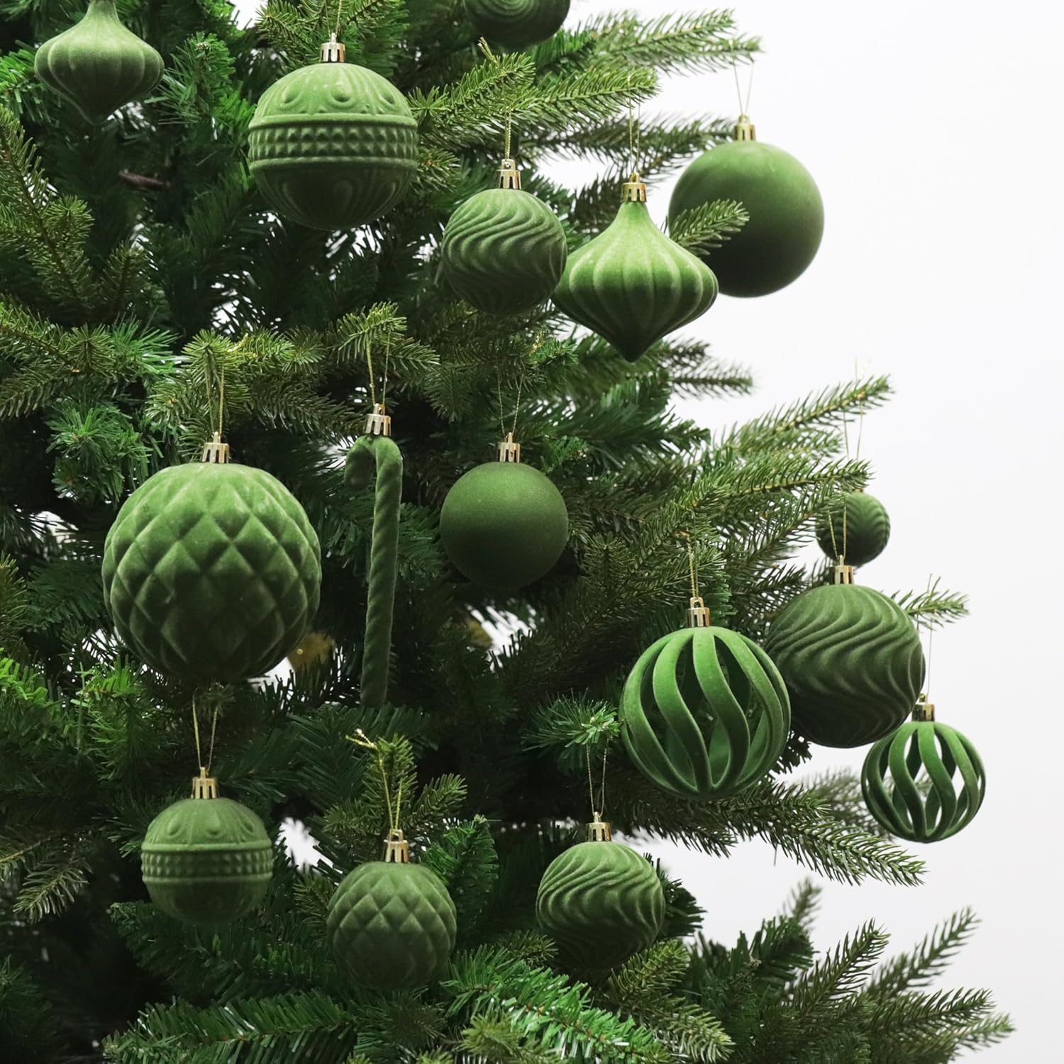 Senjie 2025 Velvet Christmas Ornaments Sets for Christmas,63pcs Xmas Tree Bulk Flocked Shatterproof Christmas Ornaments Balls Decoration Avocado Green