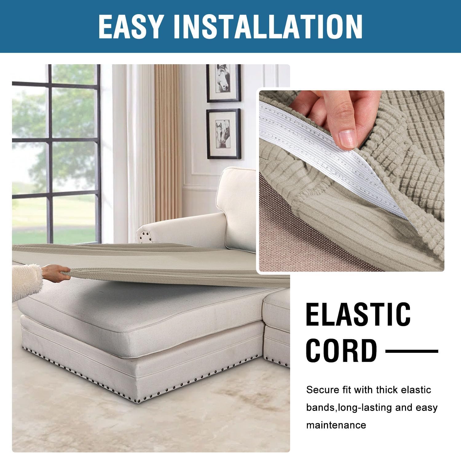 - NON SLIP: Effortless for installation (guide photos on selling page), sewn with thick elastic loops to cover the bottom edges. It is easy to install and take off, making your home more harmony, high recommended for both leather and cloth furniture