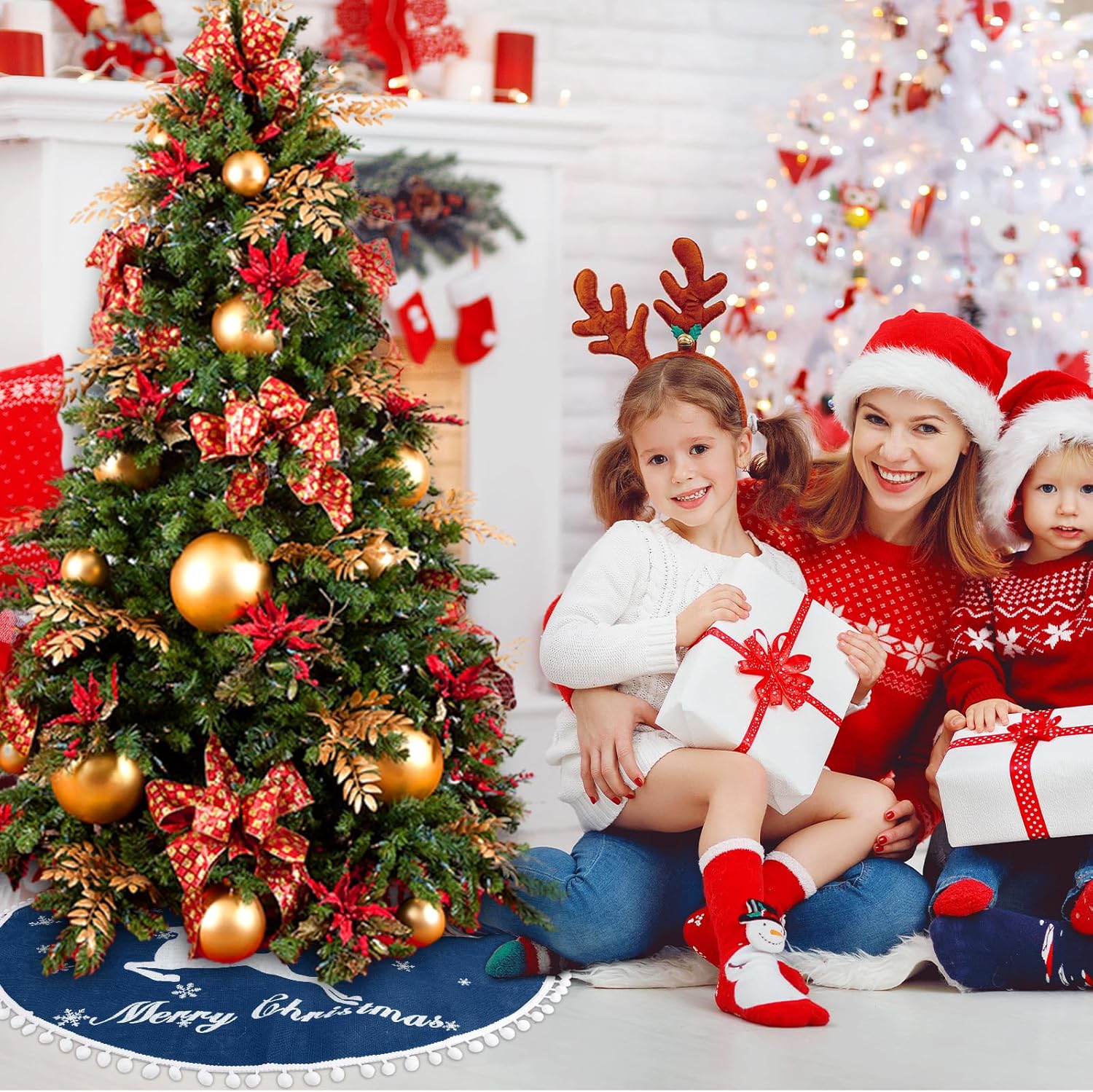 • Merry Christmas Tree Skirts:Our xmas tree skirt is printed with elk and various sizes of snow patterns, as well as the words "Merry Christmas." The edges are adorned with small, fluffy balls, adding a festive touch to your Christmas tree. This 24-inch tree skirt is perfectly sized for most Christmas trees perfectly. Before making a purchase, please measure the diameter of your tree to ensure a perfect fit