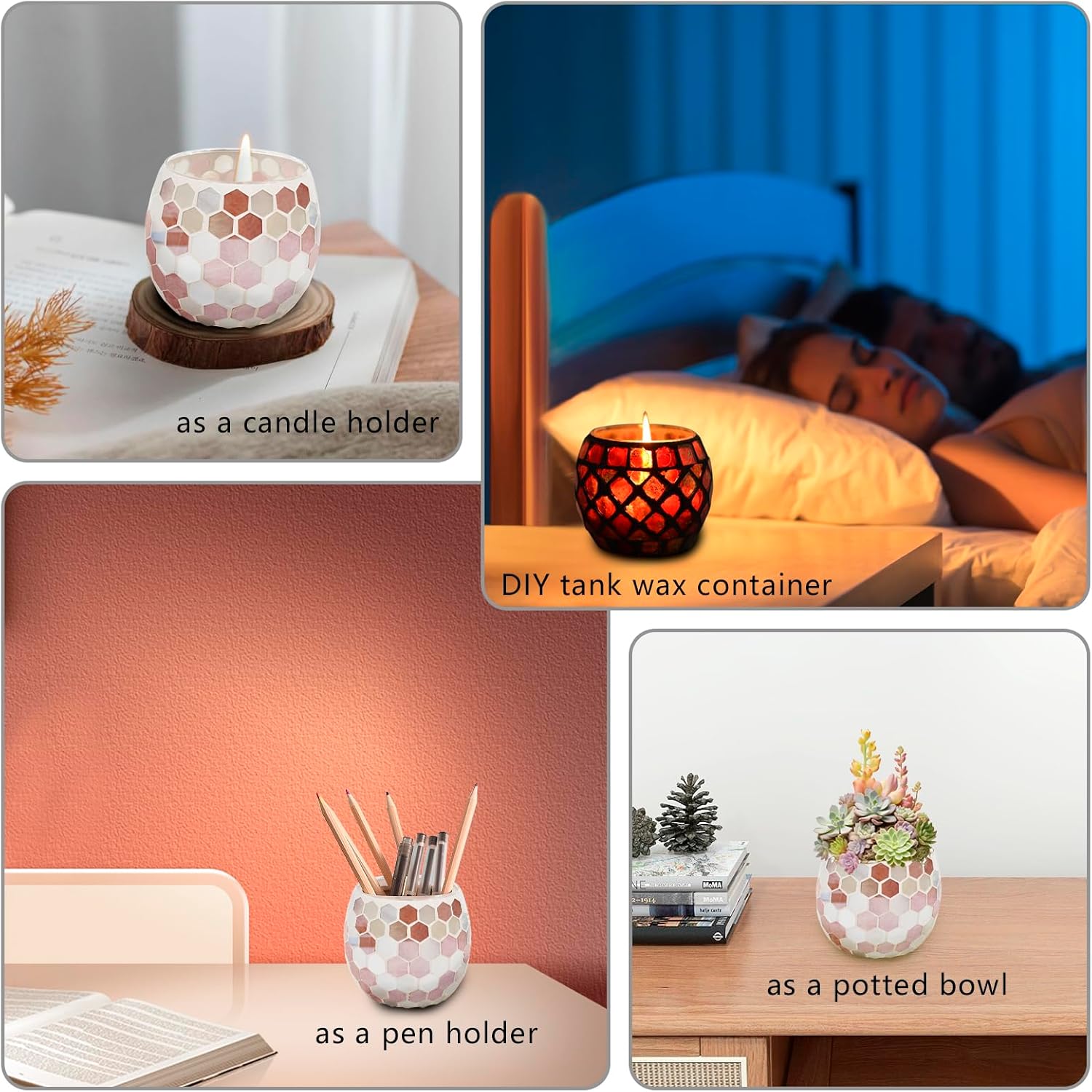 - HANDMADE OF HIGH QUALITY MOSAIC GLASS - This stunning tealight candle holder is crafted from hundreds of colorful glass fragments carefully placed on a thick glass bowl. Each votive candle holder is handmade, providing long durability and strong water & dust resistance