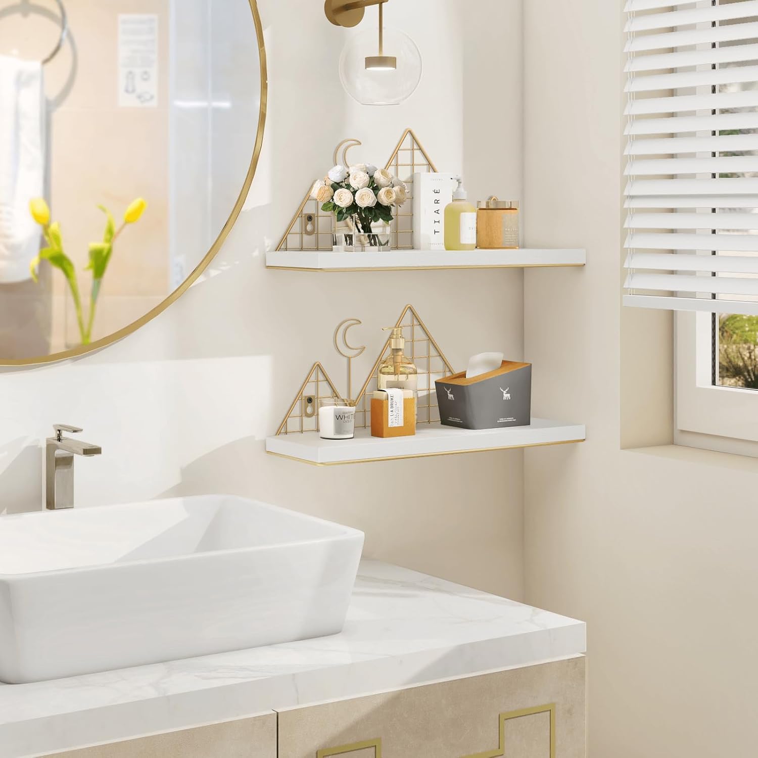 Homode Floating Shelves, Set of 2 Mountain Shelves Wall Decor, Metal and Wood Hanging Shelves Woodland Bookshelf for Nursery, Kids Room, Bathroom, Bedroom, White and Gold