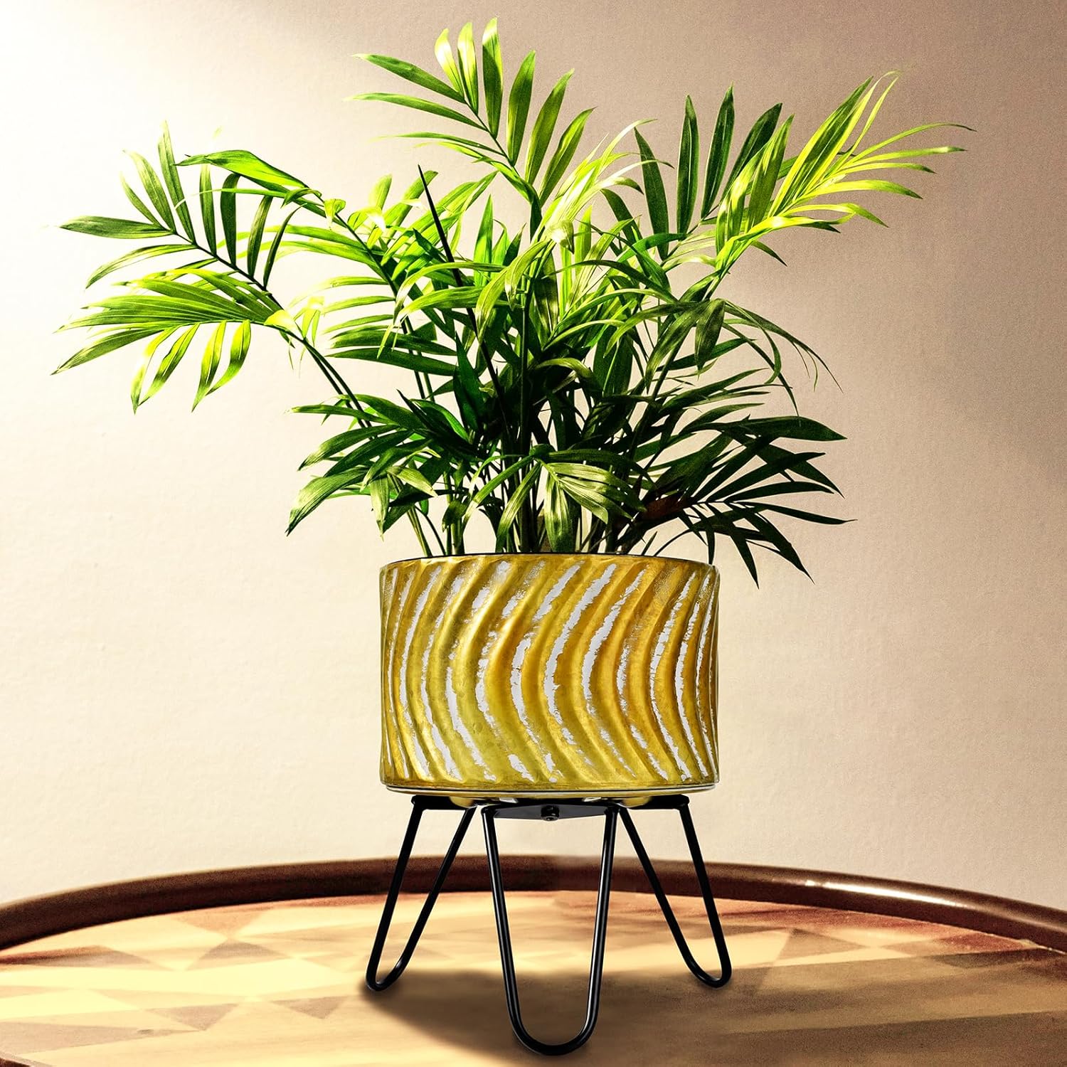 Harvest Land Plant Pots with Stand, Set of 2 Large Modern Planters Metal Tall Handmade Flower Pots with Drainage Holes Indoor Outdoor,Gold