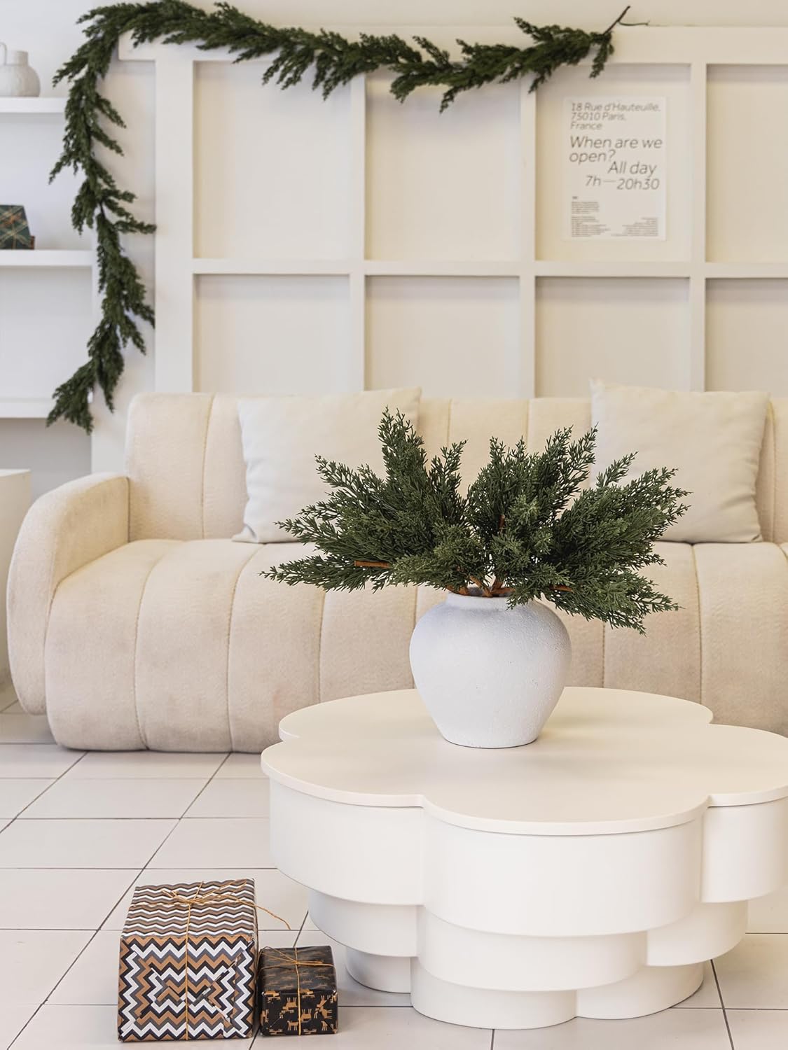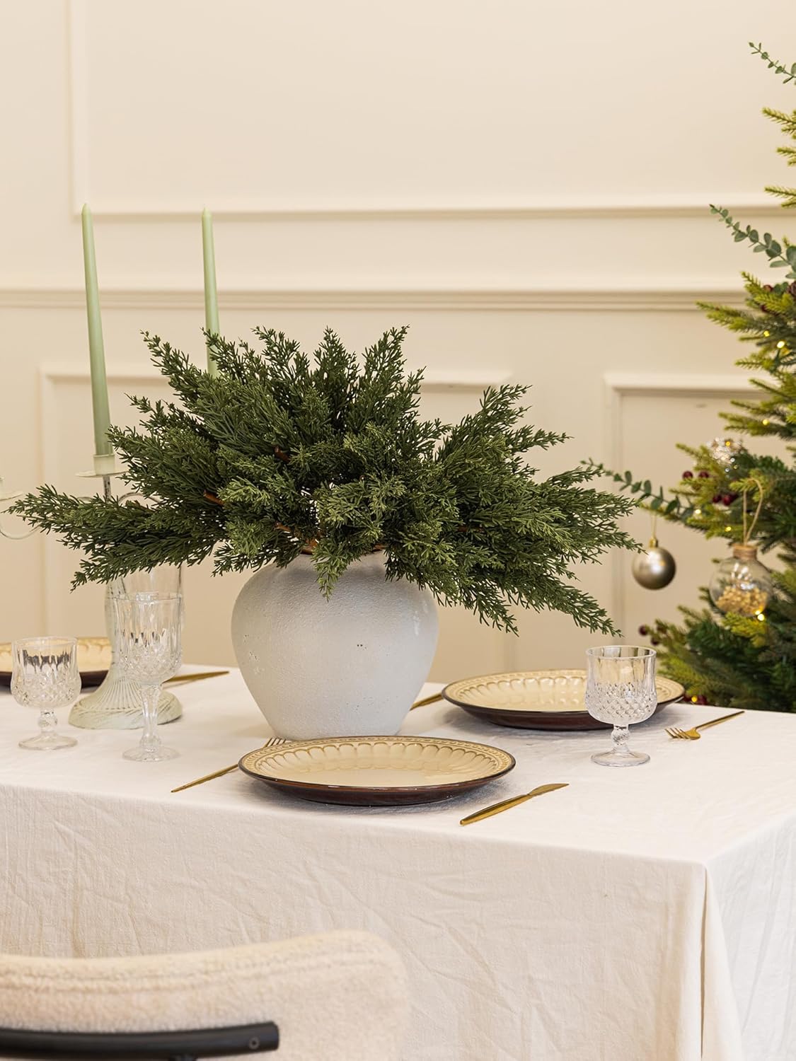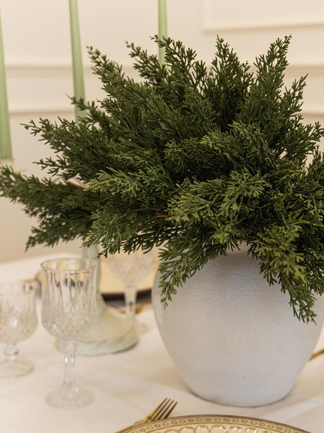 - 【Premium Quality and Natural Appearance】Crafted from high-quality PE, these branches mimic the natural green color of real cedar, offering both aesthetic beauty and durability. After opening the package, simply let the product air out for a few hours to eliminate any initial odor, ensuring a better experience. Note: Vase not included.