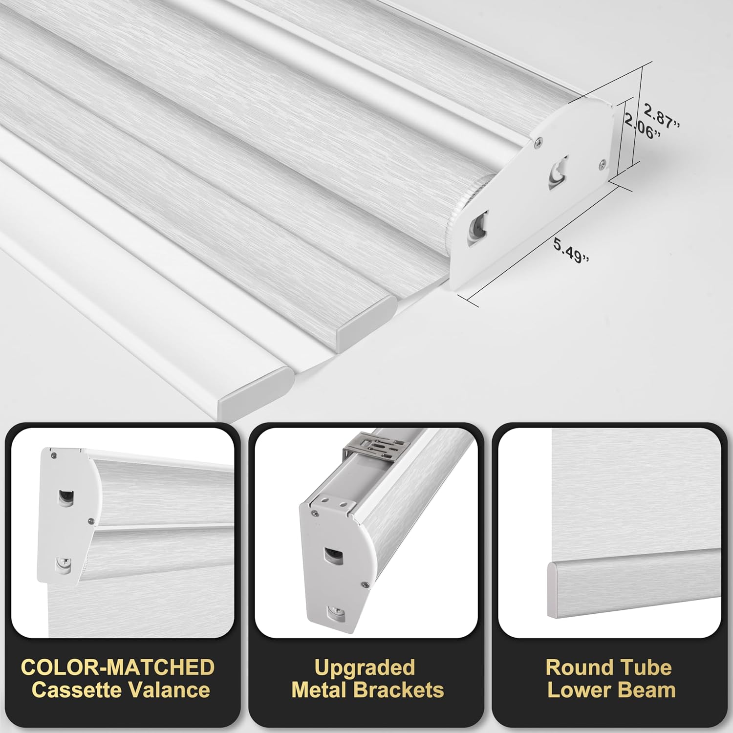- FREE STOP CORDLESS SYSTEM:The cordless double roller shade prioritizes safety with a cordless design designed for families with small children or pets.You just need to pull down or push up to stop at any position you want. COLOR-MATCHED CASSETTE VALANCE:The hidden installation of the cordless roller blinds can effectively reduce installation gaps, reduce light leakage.The color of the cassette valance is same as the fabric color,making the day night blinds more beautiful after installation.