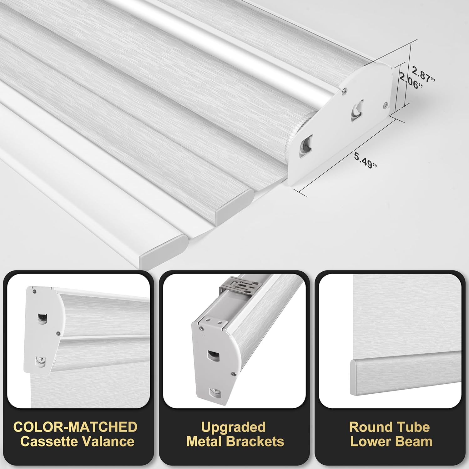 - FREE STOP CORDLESS SYSTEM:The cordless double roller shade prioritizes safety with a cordless design designed for families with small children or pets.You just need to pull down or push up to stop at any position you want. COLOR-MATCHED CASSETTE VALANCE:The hidden installation of the cordless roller blinds can effectively reduce installation gaps, reduce light leakage.The color of the cassette valance is same as the fabric color,making the day night blinds more beautiful after installation.
