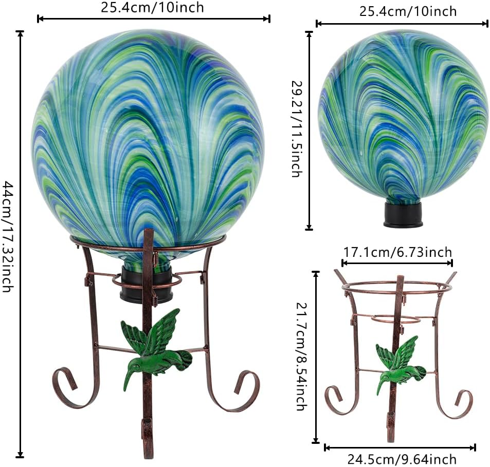 • PERFECT SIZE: This gazing ball is 10 inches in diameter and 11.5 inches high.The base of the gazing ball is 1.5 inches high and 2.1 inches in diameter.The gazing ball stand is 15 inches hih.The rubber cap on the bottom protects the edges from damage from bumps and vibrations and makes this gazing ball easier to display on a stand (stand included)