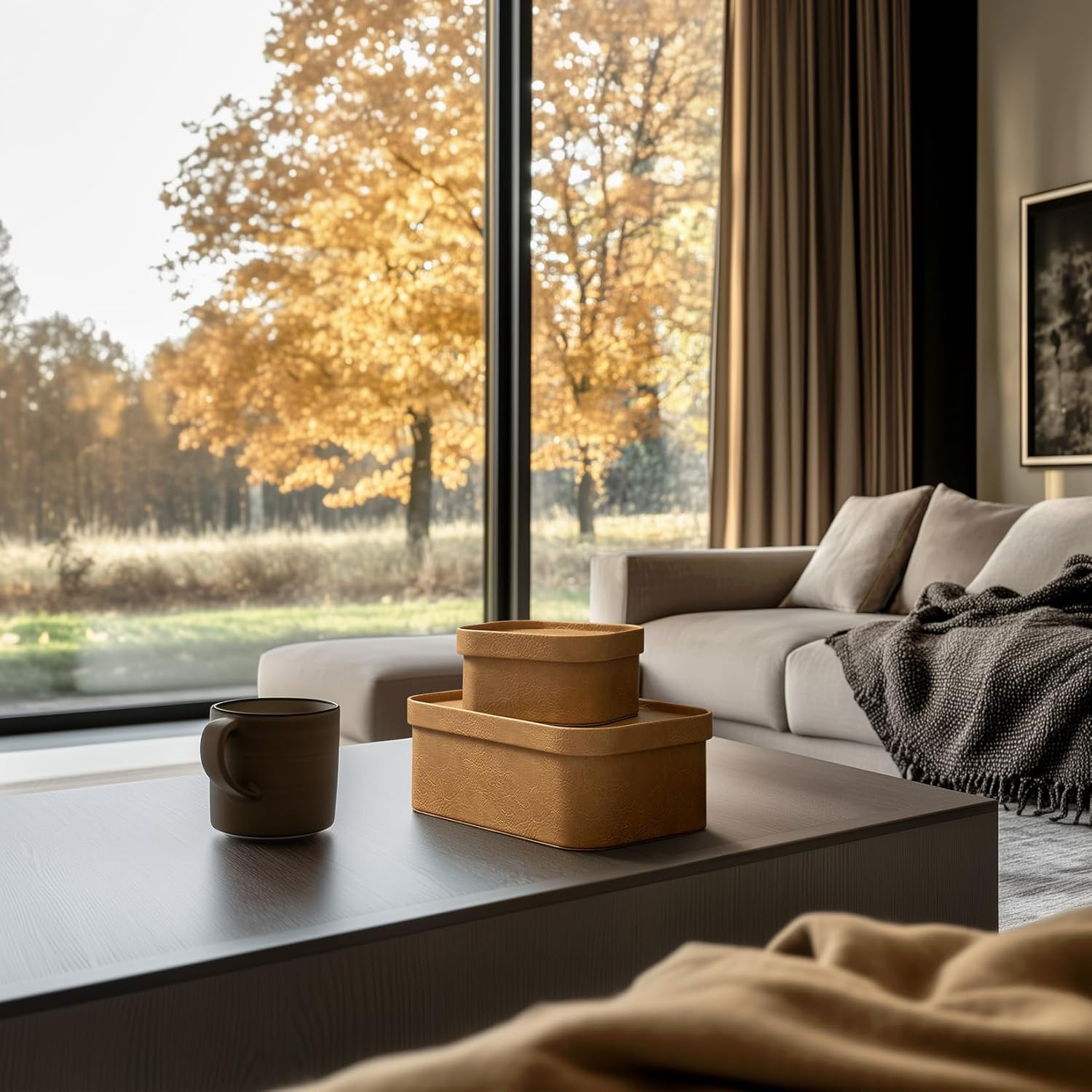 - SUSTAINABLE STYLE MEETS URBAN CHIC: Unleash your inner design maven with our game-changing storage boxes. Dressed in a refined camel vegan leather that screams sophistication, these eco-friendly beauties are more than just storage—they're a lifestyle statement. Crafted from premium MDF and wrapped in buttery-smooth vegan leather, these boxes are your ticket to clutter-free, Instagram-worthy spaces